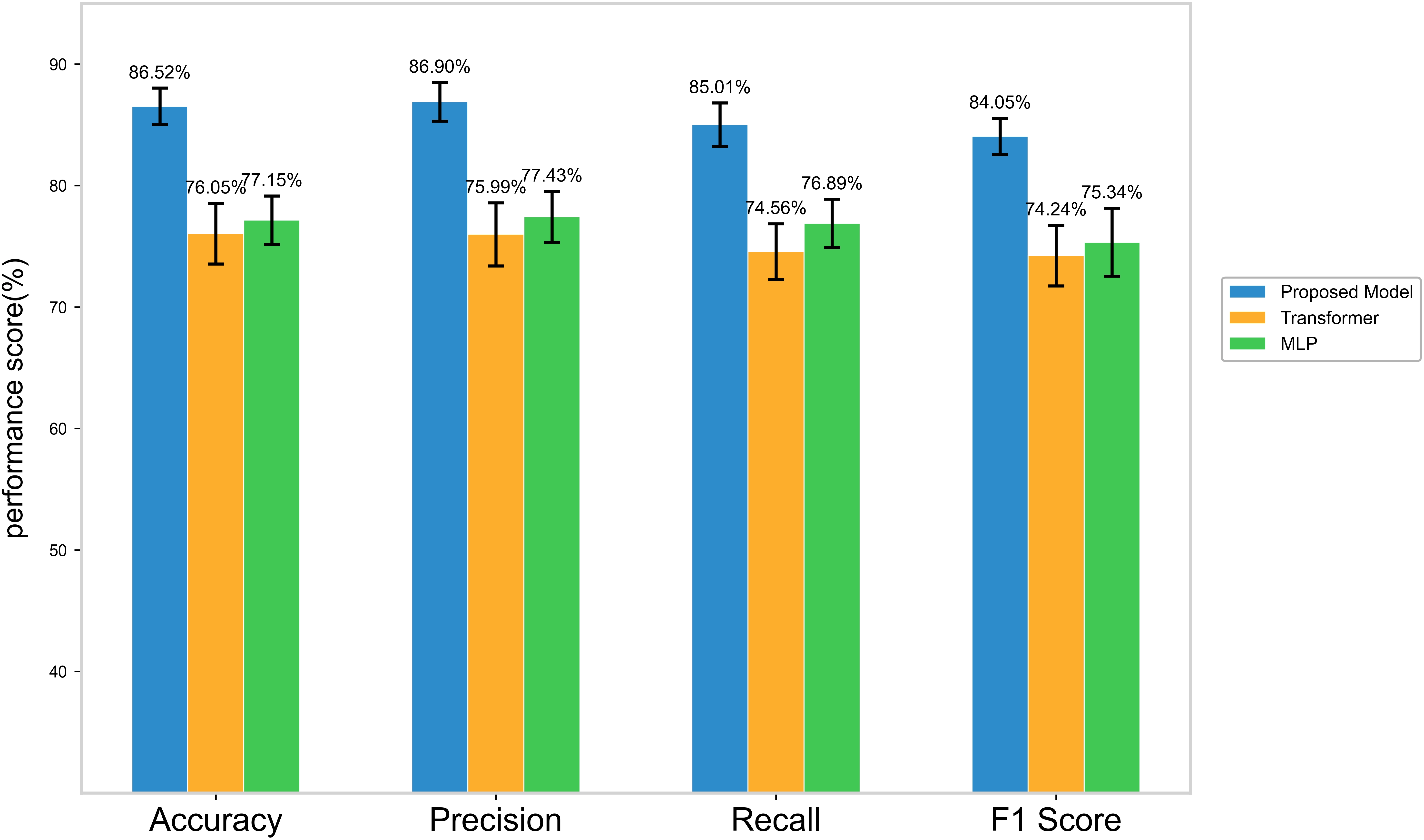 The results compared with different baseline models are shown in Table 2. Traditional CNNs and LSTM models exhibit significantly lower classification accuracy on real-world datasets compared to other models. Therefore, this paper will focus on comparing the results of the proposed model with those of BiLSTM, RCNN, and Transformer. As shown in Figure 4, the proposed model achieved the highest classification accuracy (86%), performing best among all tested models. MLP achieved an accuracy rate of 76%, slightly higher than the Transformer model (73%). Additionally, both BiLSTM and RCNN achieved accuracy rates around 75% as shown in Figure 5. However, none of these models meet the requirements for practical application.