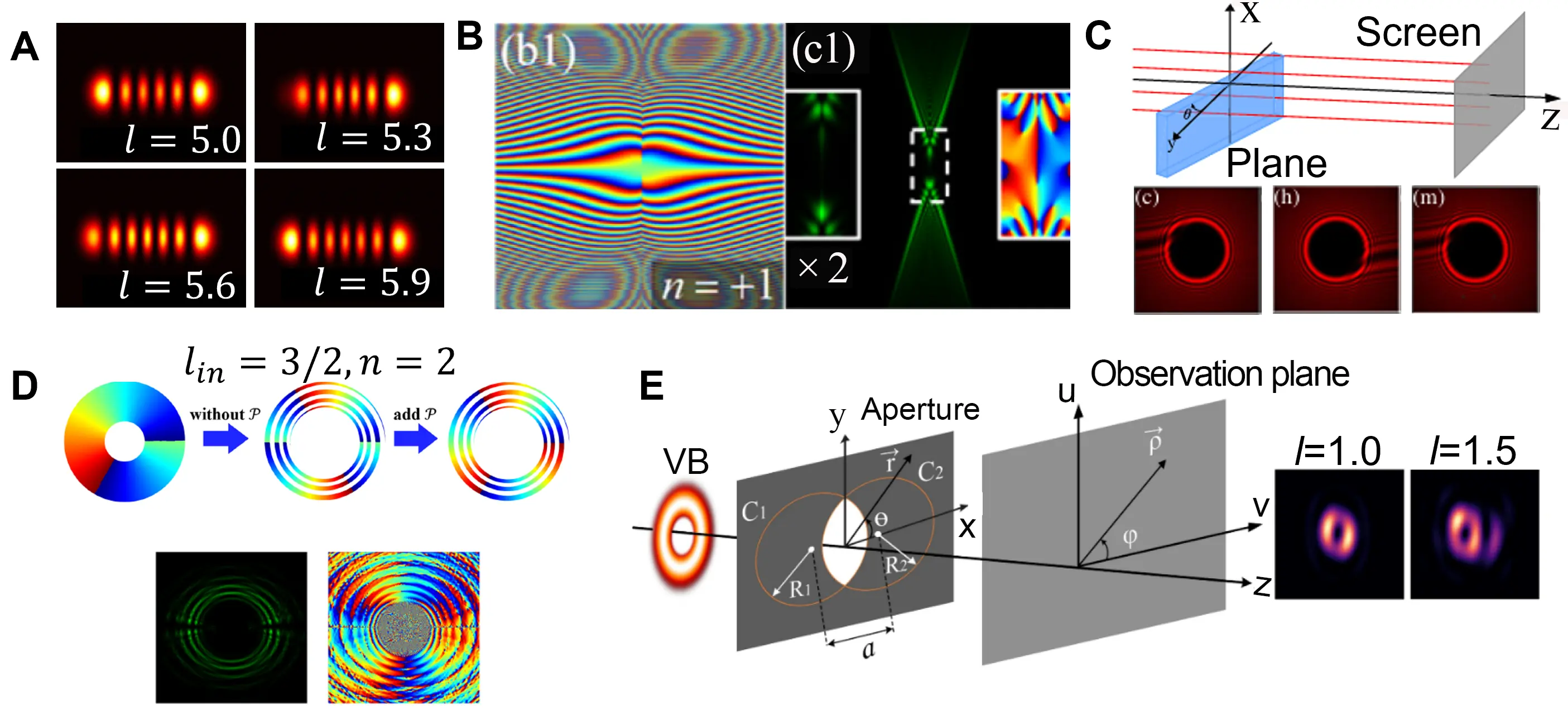 Figure 10. Measurement methods based on the diffraction through phase and amplitude masks. (A) The intensities of mode converted fractional vortex beam with vary TCs. Republished with permission from[128]; (B) The rotating beam phase and the intensities of modulated fractional vortex beam at far field. Republished with permission from[88]; (C) Fractional vortex measurement with rotational phase plate and the modulated intensities. Republished with permission from[129]; (D) Integer OAM conversion of fractional vortex beams based on spiral slits and the simulation intensities[87]; (E) The intersecting circular aperture to modulate the fractional vortex beam and resulting intensities[130].