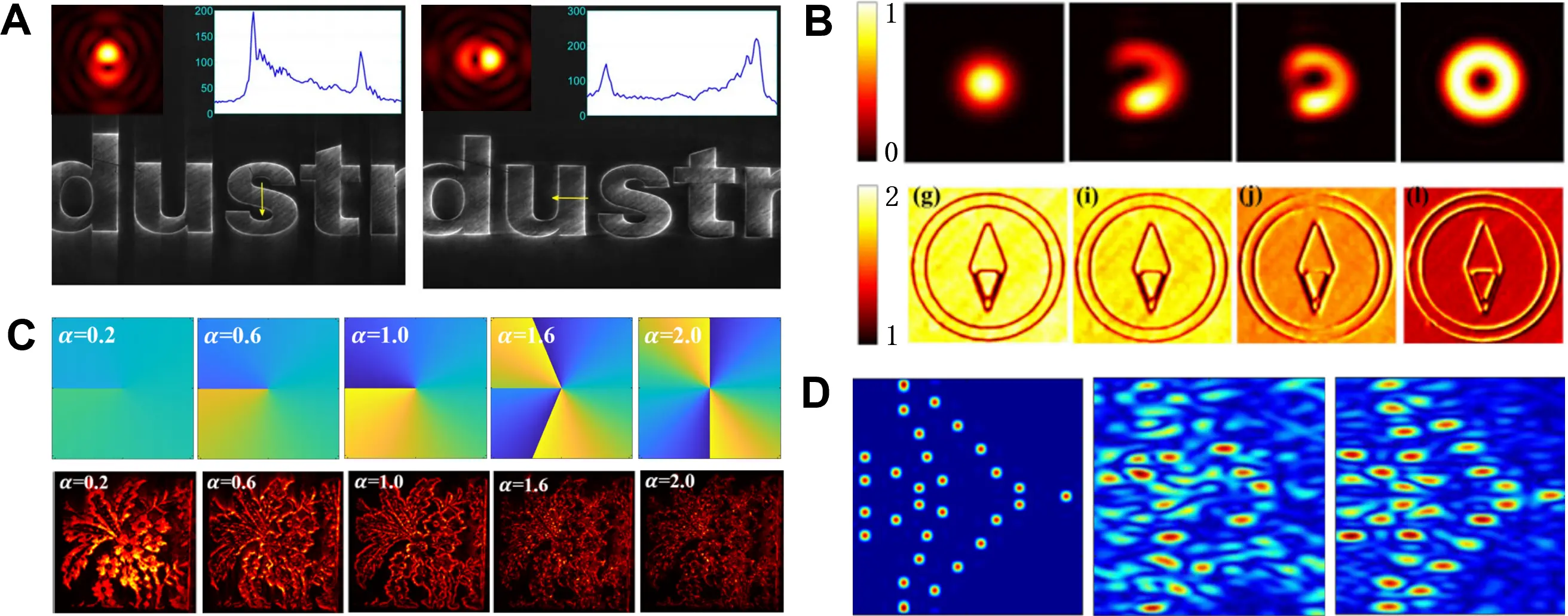 Figure 4. Functional fractional vortex beams. (A) Spiral fractional vortex beams[17]; (B) Fractional vortex arrays (m = 3.5). Republished with permission from[18]; Fractional vortex beam (m = 6.5) superimposed with 5 Laguerre-Gaussian modes (C) with and (D) without the same Gouy phase. Republished with permission from[19].