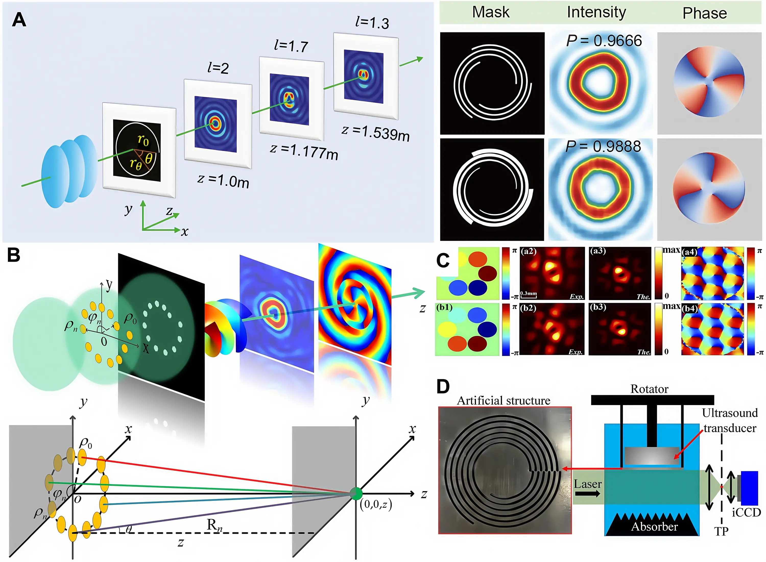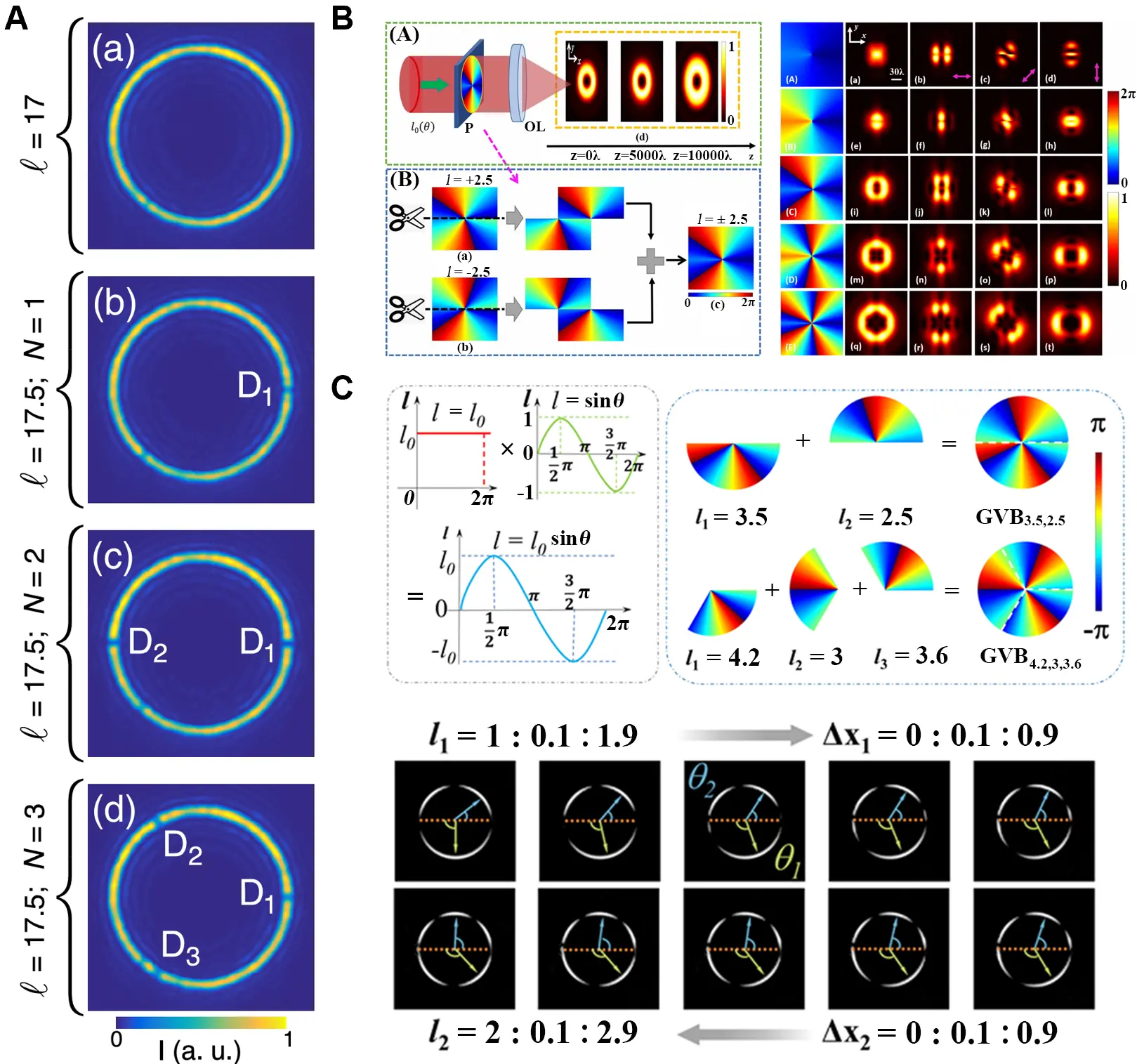 AB denotes a ring-shaped beam generated by an axicon, and N is the number of dislocations uniformly distributed along the ring. An example of m = 17.5 with 0, 1, 2, and 3 slit openings are shown in Figure 3A[15].