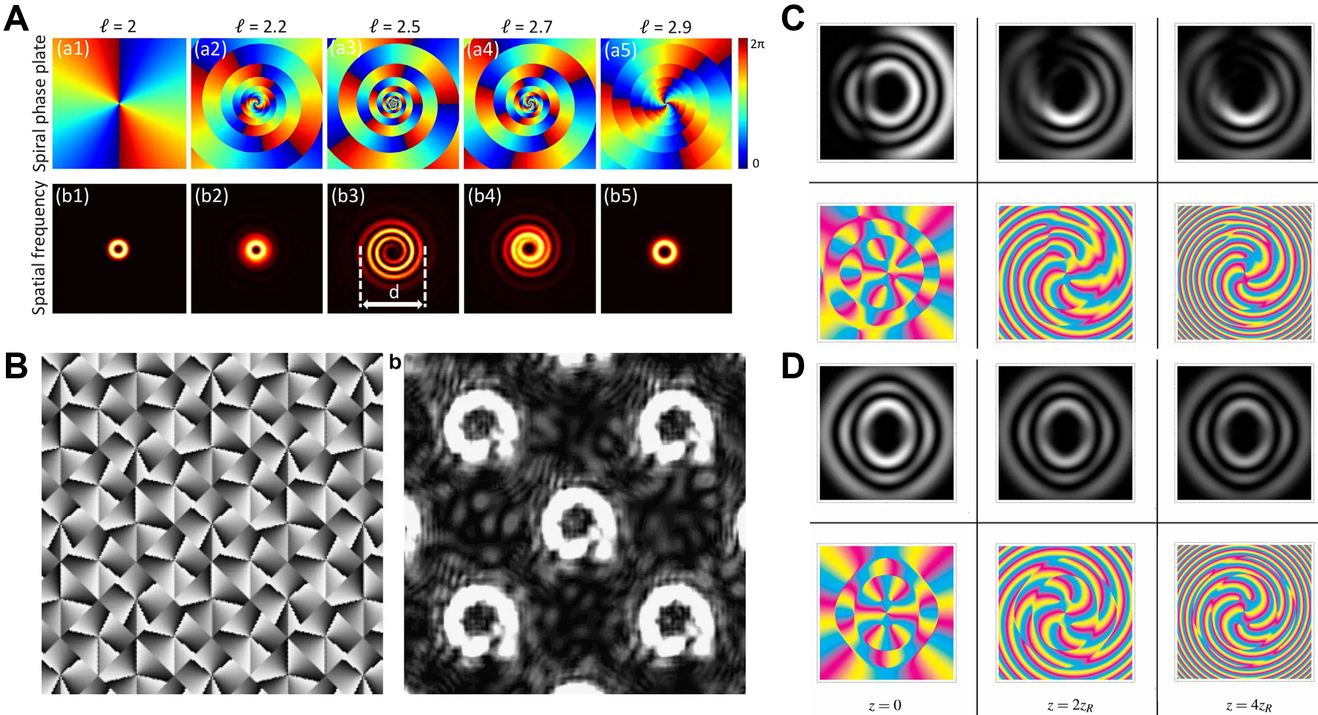 Fractional vortex arrays (Figure 4B) can be generated using a phase-only Talbot array illuminator, yielding high efficiency and compression ratio. Their complex-valued amplitude is written as[18]: