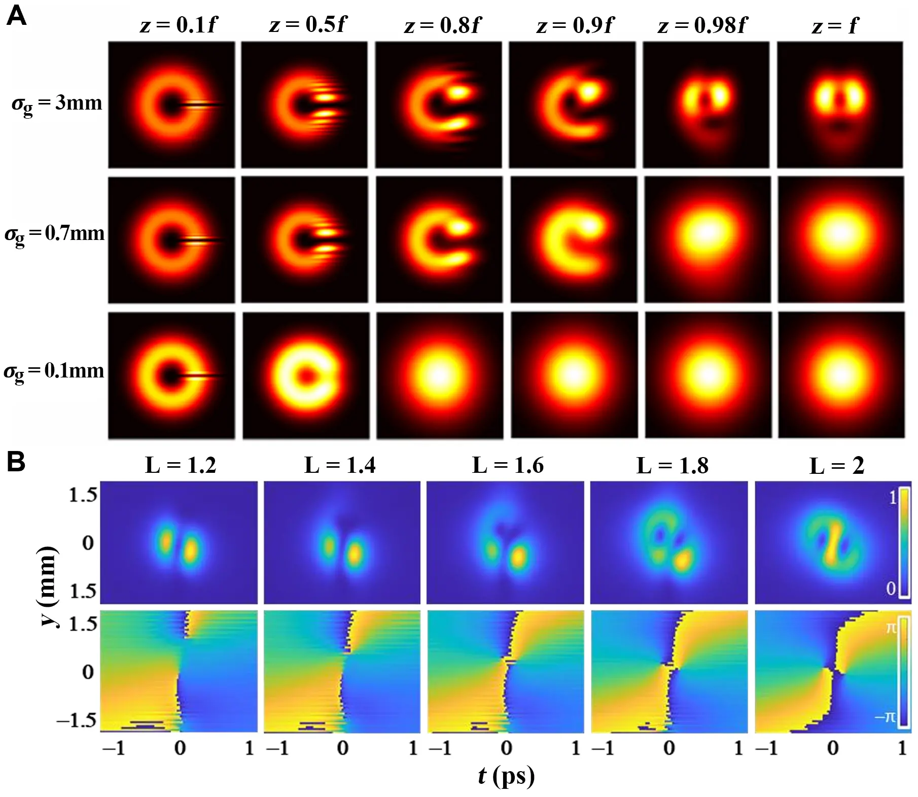 The difference of fractional vortex propagation of high and low degree of coherence can be found in Figure 5A. The slit opening toward the focal plane disappears gradually with the decrease of coherence.