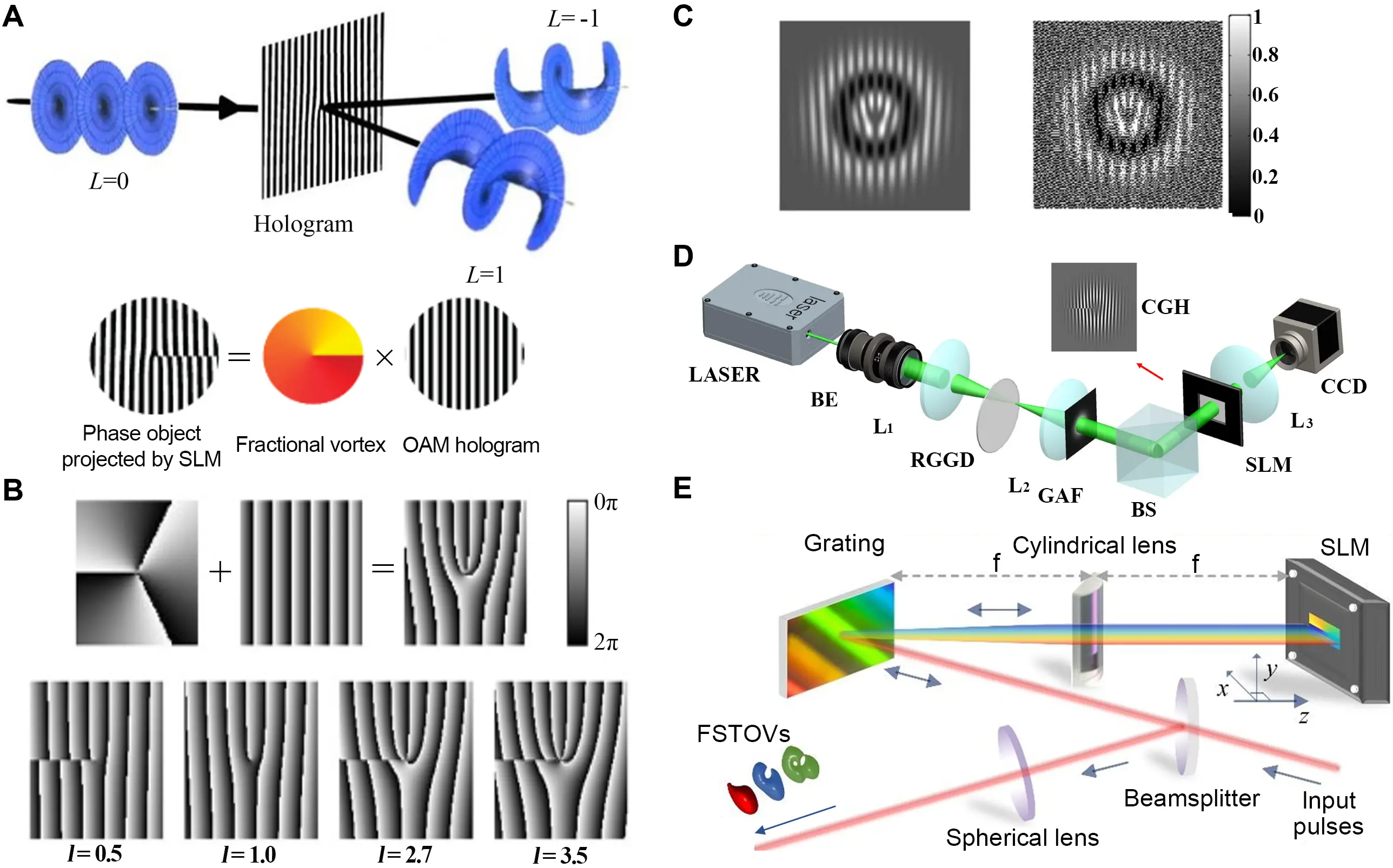 Figure 6. Fractional vortex beam generation with spatial light modulator or digital micromirror device. (A) Amplitude-type spatial light modulator loaded with a fork grating[79]; (B) Holograms loaded on the phase-only spatial light modulator[14]; (C) Binary hologram for digital micromirror device. Republished with permission from[123]; (D) Experimental setup for generating a partially coherent fractional vortex beam[42]; (E) Experimental setup for the generation of fractional spatiotemporal optical vortex pulses. Republished with permission from[69]. SLM: spatial light modulator; OAM: orbital angular momentum; BE: beam expander; RGGD: rotating ground-glass disk; GAF: Gaussian amplitude filter; BS: beam splitter; CGH: computer-generated holograms; CCD: charge-coupled device.