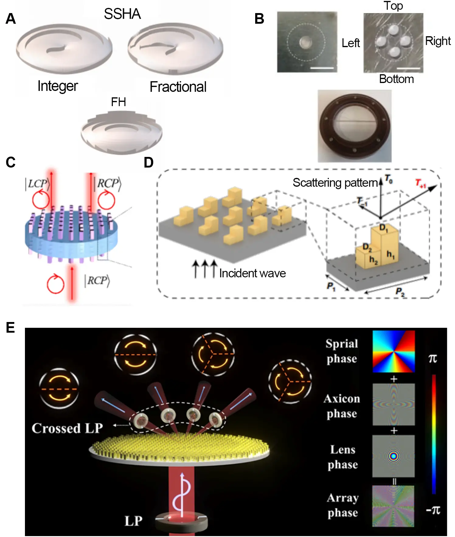 Figure 7. Generation of fractional vortex beams using spiral phase plates and metasurfaces. (A) Generation with frequency multiplexing in the terahertz band using a vortex phase plate and a metallic mask. Republished with permission from[73]; (B) Generation of a terahertz fractional vortex beam via a spherical spiral axicon[81]; (C) Double-layer dielectric metasurface optimized with machine learning. Republished with permission from[72]; (D) Metamaterial module integrated with a metalens module fabricated via 3D-printing[83]; (E) Generation of a perfect vectorial fractional vortex beam using an all-dielectric geometric metasurface. Republished with permission from[82].