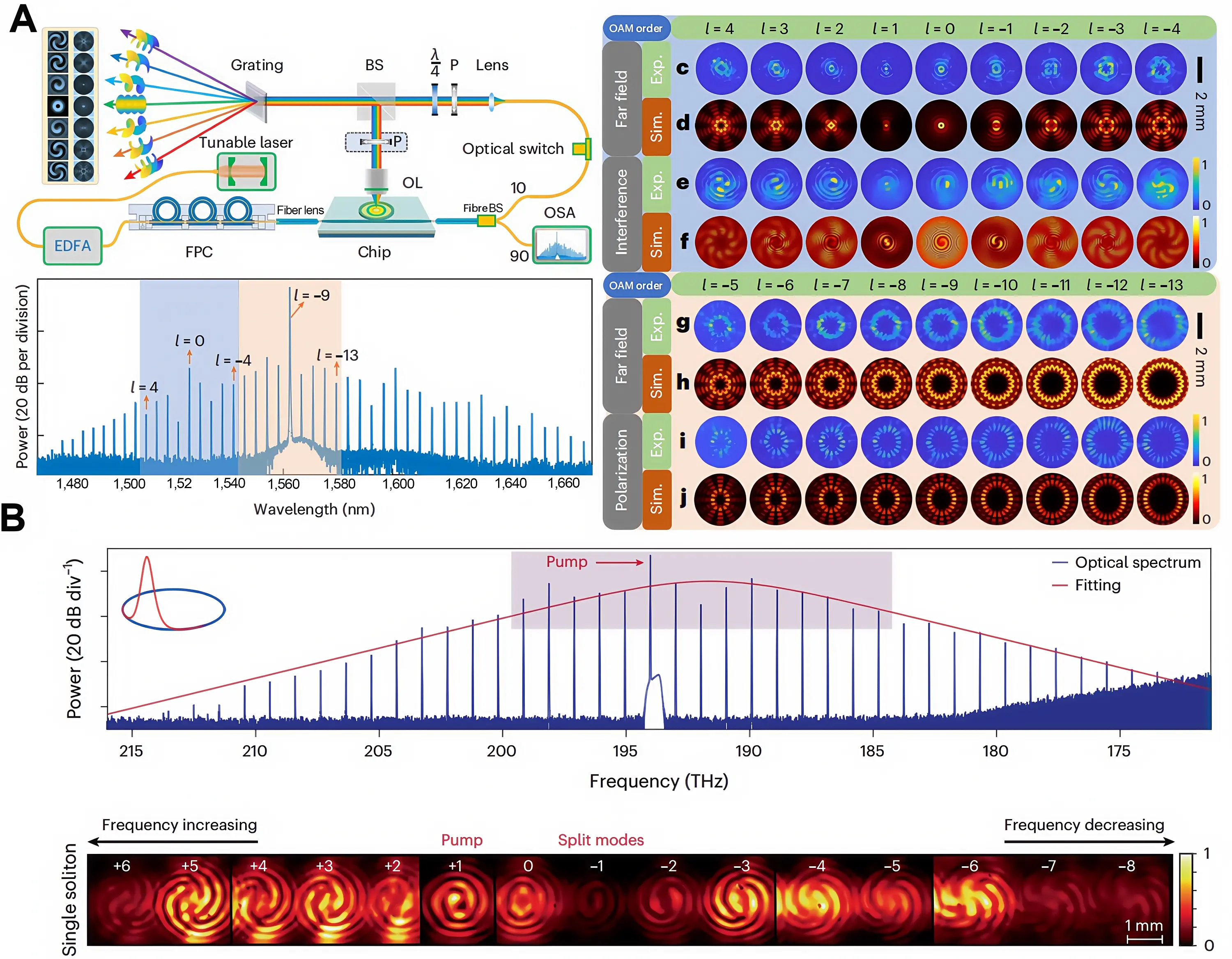 Figure 9. On-chip generation of an OAM comb. (A) Schematic of the experimental setup and results for generating an OAM frequency comb using an AlGaAs-on-insulator-based nonlinear micro-ring resonator. Republished with permission from[85]; (B) Experimental results of an OAM frequency comb generated using a high-Q nonlinear ring micro-resonator on a thin-film substrate. Republished with permission from[86]. OAM: orbital angular momentum. BS: beam splitter.