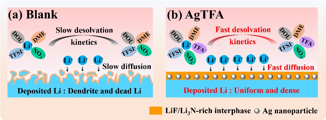 Figure 1. Schematic comparison of Li plating processes in the (a) blank and (b) AgTFA electrolyte. Li: lithium; AgTFA: silver trifluoroacetate; DOL: 1, 3-dioxopentane; TFA-: trifluoroacetate; DME: 1, 2-dimethoxyethane; TFSI-: bis(trifluoromethanesulfonyl)imide.