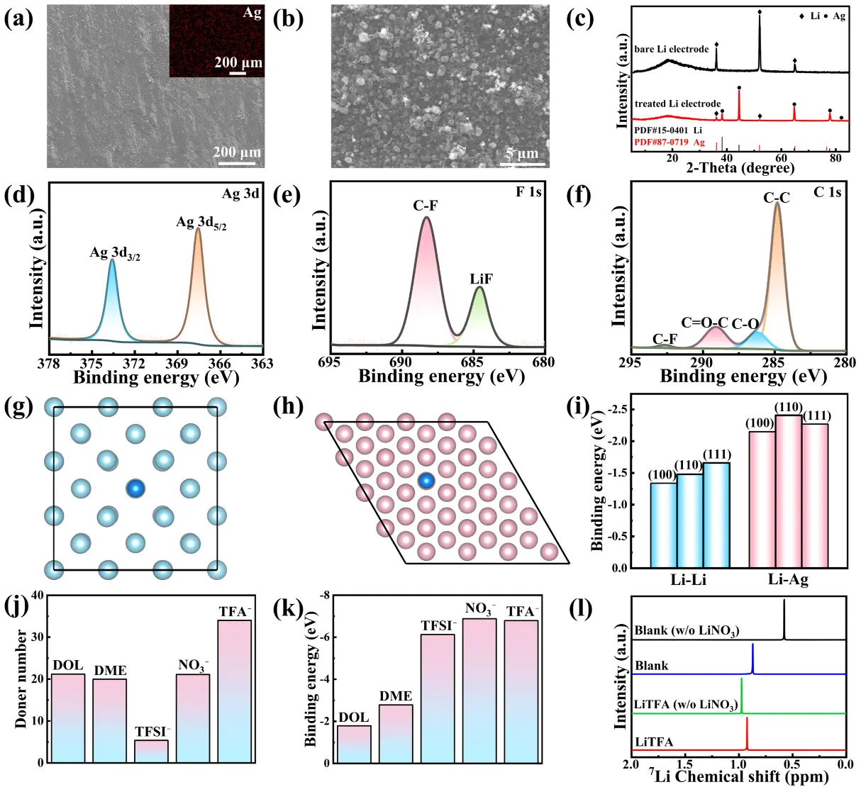 Figure 2. (a, b) SEM images and Ag distribution; (c) XRD patterns, and (d,e,f) XPS profiles (d: Ag 3d, e: F 1s; f: C 1s) of the Li electrode treated by AgTFA/DME solution; (g, h) Top views of Li atom adsorption on Li(100) and Ag(111) surfaces; (i) Binding energies of Li atom adsorption on different facets of Li and Ag surfaces; (j) Donor numbers of solvent molecules and anions in two electrolytes; (k) Binding energies of Li+ with solvent molecules and anions in two electrolytes; (l) 7Li NMR spectra of the different electrolytes. SEM: scanning electron microscope; XRD: X-ray diffraction; XPS: X-ray photoelectron spectroscopy; AgTFA: silver trifluoroacetate; DME: 1, 2-dimethoxyethane; NMR: nuclear magnetic resonance spectroscopy.