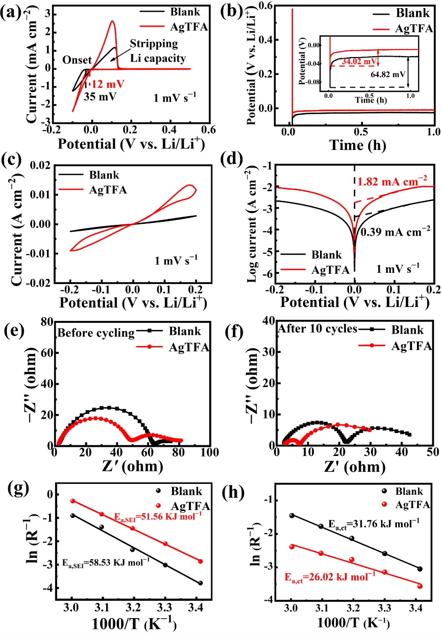 Figure 3. (a) CV curves and (b) the nucleation overpotentials of Li deposition of the Li||Cu cells in different electrolytes; (c) CV curves; (d) Tafel plots, electrochemical impedance spectra (e) before cycling and (f) after 10 cycles, and Arrhenius behavior of (g) the RSEI and (h) the Rct of Li||Li cells with different electrolytes. CV: Cyclic voltammetry; AgTFA: silver trifluoroacetate.