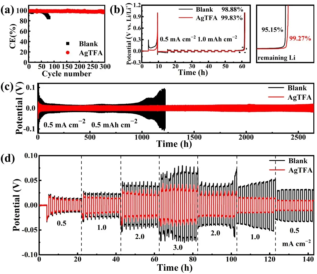 Figure 4. (a) Coulombic efficiency and (b) average coulombic efficiency of Li||Cu cells with different electrolytes; (c) Cycling performance and (d) rate performance of the Li||Li cells with different electrolytes at 0.5 mA·cm-2 for 0.5 mAh·cm-2. AgTFA: silver trifluoroacetate.
