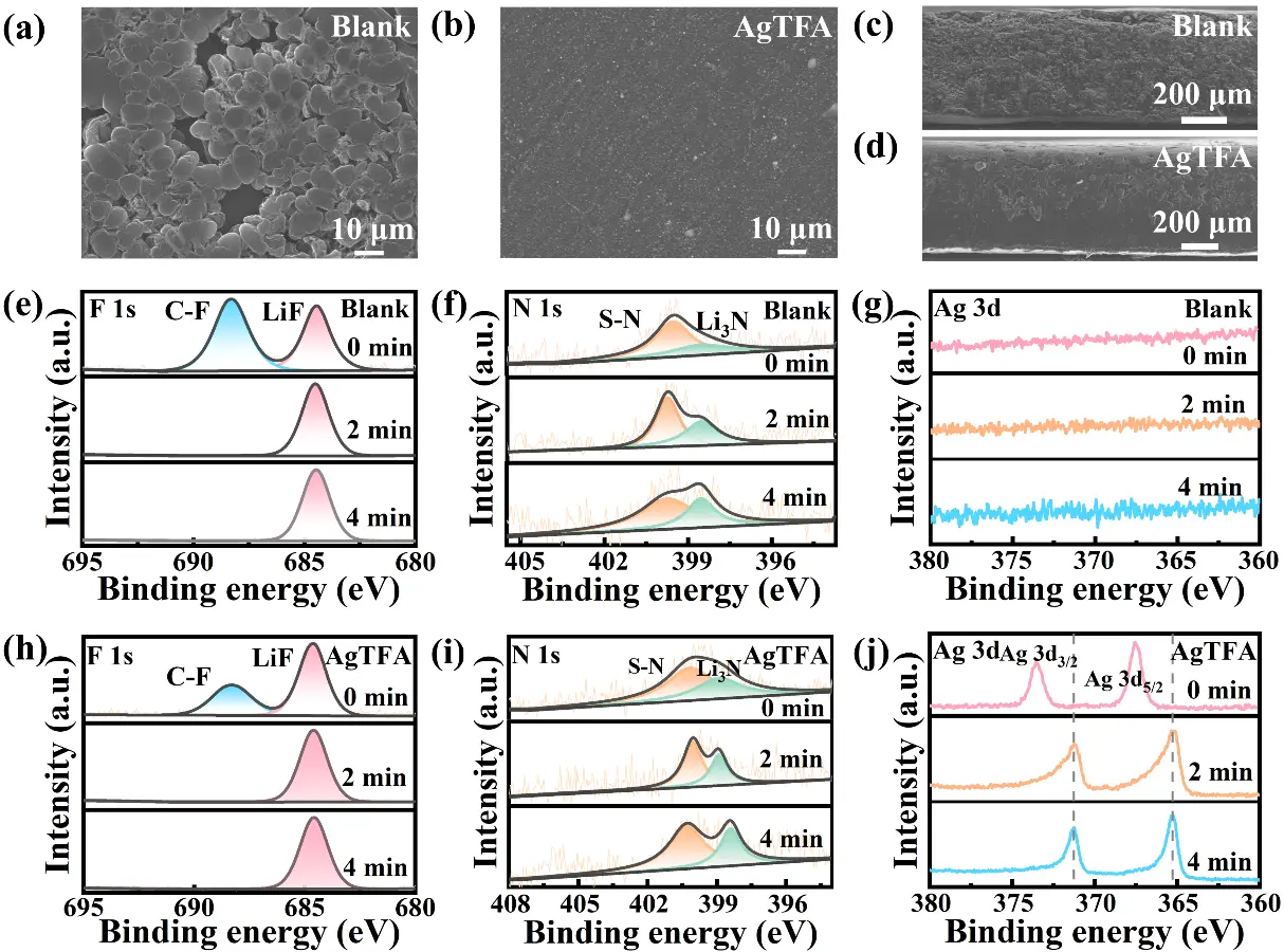 Figure 5. Top-view SEM images of Li metal anode after 10 cycles in (a) blank electrolyte and (b) AgTFA electrolyte; Cross-sectional SEM images of Li metal anode after 50 cycles in (c) blank electrolyte and (d) AgTFA electrolyte; (e, f, j) XPS spectra (e and h: F 1s, f and i: N 1s, g and j: Ag 3d) with etching depth profiles of the SEI on Li metal anode surface after 10 cycles in different electrolytes. SEM: scanning electron microscope; AgTFA: silver trifluoroacetate; XPS: X-ray photoelectron spectroscopy.