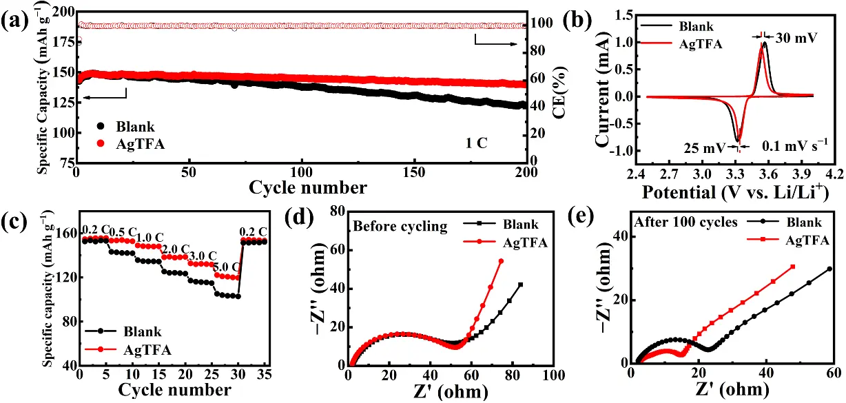Figure 6. (a) Cycling performance of Li||LFP cells using different electrolytes at 1.0 C; (b) CV curves of Li||LFP cells; (c) Rate performance of Li||LFP cells using different electrolytes; and EIS plots of Li||LFP cells using different electrolytes (d) before cycling and (e) after 100 cycles at 1.0 C. Li: lithium; CV: Cyclic voltammetry; AgTFA: silver trifluoroacetate; LFP: lithium ferro-phosphate.
