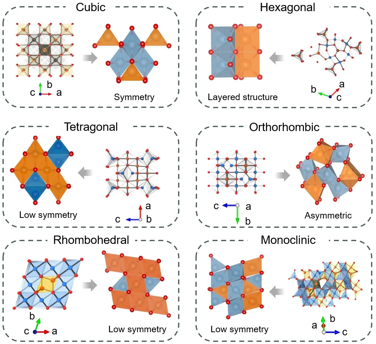 Figure 2. Representative cubic-to-triclinic phases illustrate symmetry evolution, coordination geometry, lattice distortion, and vacancy ordering, and their roles in determining the electronic structure and electrocatalytic activity.