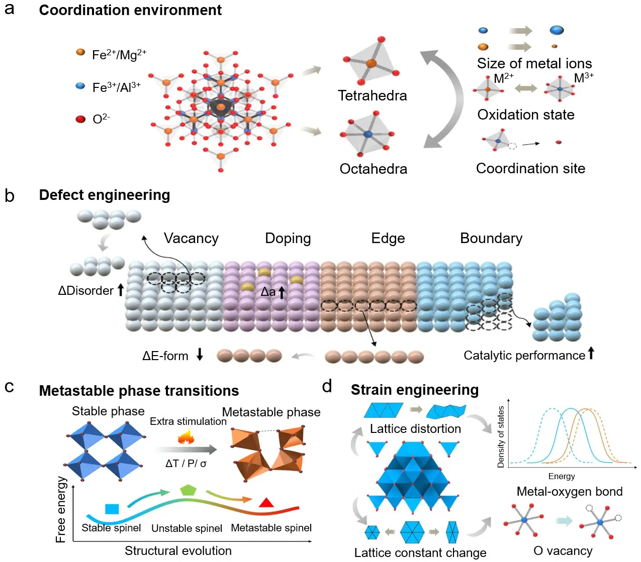 Figure 3. Structural modulation strategies in spinel oxides. (a) Coordination tuning through metal-ion occupation of tetrahedral and octahedral sites, governed by ionic size, oxidation state, and local geometry; (b) Defect engineering, including vacancies, doping, edge and boundary defects, to tailor lattice disorder, formation energy, and reactivity; (c) Metastable phase transitions induced by thermal, chemical, or mechanical stimuli, leading to structural distortion and modified coordination; (d) Strain engineering to adjust lattice constants, metal-oxygen bonding, and electronic states, thereby enhancing catalytic activity.