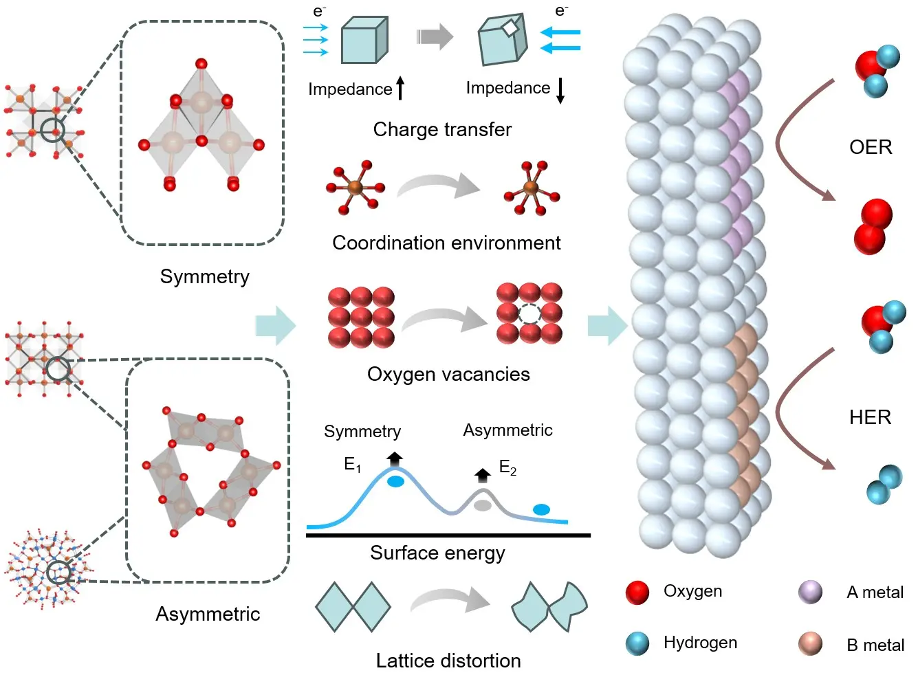 Additionally, charge transfer rates are a critical factor in electrocatalytic performance. In lower-symmetry phases, due to lattice irregularities and the presence of oxygen vacancies, the electronic conductivity and charge transfer rates are typically higher, allowing stable catalytic activity even under high current densities[194,195]. Efficient charge transfer in the OER, for example, facilitates the breakdown of water molecules, enhancing the overall reaction rate.