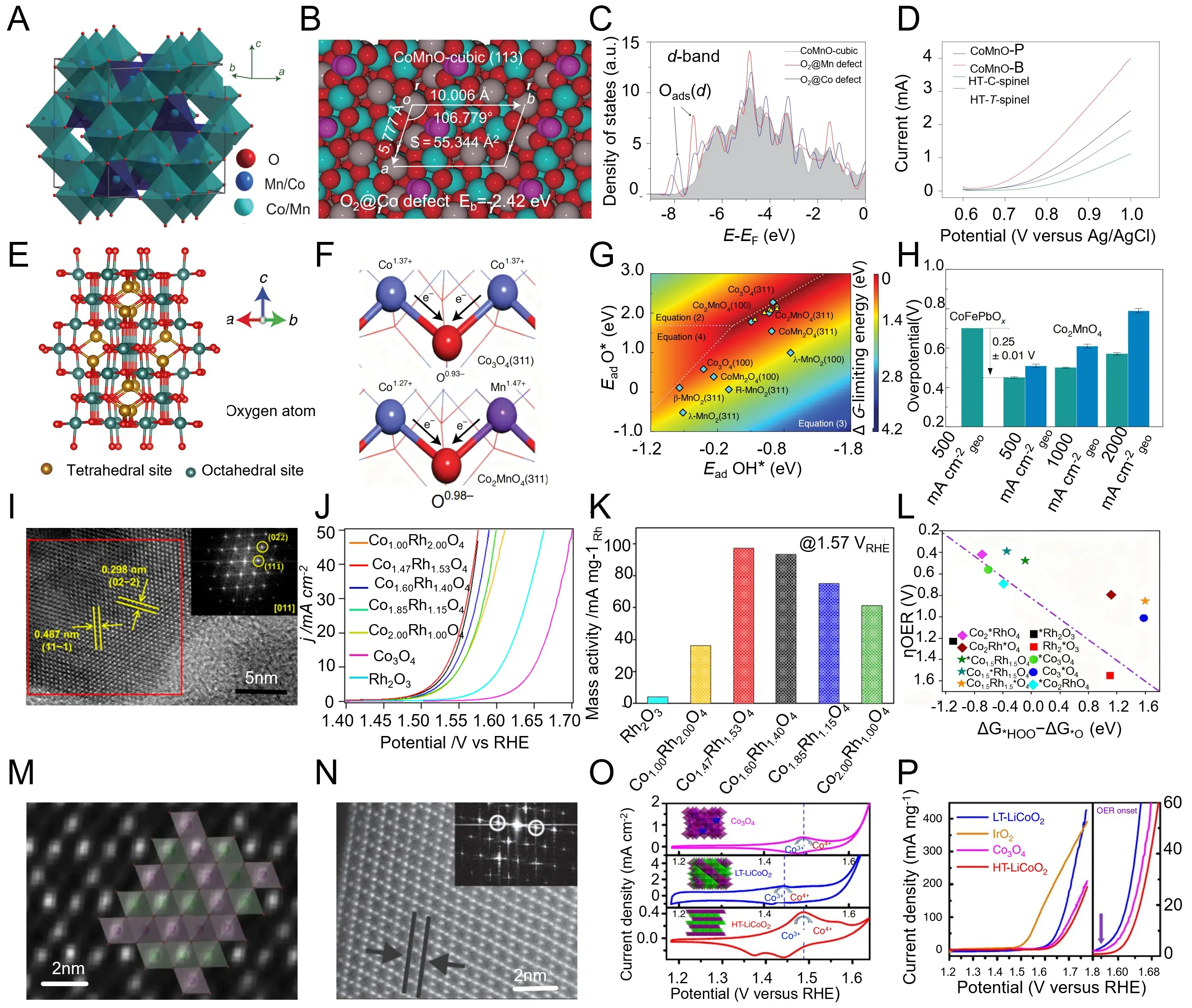 Figure 5. (a) Crystal structure model of Co-Mn-O spinel showing Mn/Co octahedra; (b) Atomic configuration and oxygen-vacancy formation energy in Co-Mn-O with highlighted local structural parameters; (c) Calculated DOS for Co-Mn-O showing d-band modulation induced by oxygen-vacancy configurations; (d) Electrochemical polarization curves of various Co–Mn–O phases (CoMnO-P, CoMnO-B, HT-C-spinel, HT-T-spinel). Republished with permission from[215]; (e) Crystal structure model of Co2MnO4 showing tetrahedral and octahedral cation sites; (f) Schematic of surface adsorption configurations (OH-, O) on Co2MnO4(311) and Co3O4(311) surfaces; (g) Energy landscape diagram correlating Ead(O) and E3d(O) for different Co-Mn-O surfaces; (h) Comparison of OER overpotentials of Co2MnO4 and Co-Fe-B2O4 under different current densities. Republished with permission from[198,216]; (i) HRTEM image and FFT pattern of CoxRh3-xO4 showing well-ordered spinel lattice; (j) LSV polarization curves of CoxRh3-xO4 spinels showing composition-dependent activity; (k) Mass activity comparison of RhO2, Co3O4, and CoxRh3-xO4 at 1.57 V RHE; (l) Scaling relationship between log(OER activity) and ΔGHOO - ΔGO for various CoxRh3-xO4 compositions. Republished with permission from[202]; (m) Atomic-resolution HAADF-STEM image of LT-LiCoO2 showing the local spinel-like atomic arrangement; (n) HRTEM image and FFT pattern showing lattice ordering and phase transition features in LiCoO2; (o) LSV polarization curves comparing Co3O4, HT-LiCoO2 and LT-LiCoO2; (p) OER polarization and ORR activity comparison of LiCoO2-derived materials and reference Co3O4. Republished with permission from[206]. DOS: density of states; OER: oxygen evolution reaction; HT: high temperature; LT: low temperature; FFT: fast Fourier transform; ORR: oxygen reduction reaction; LSV: linear-sweep voltammograms; RHE: reversible hydrogen electrode; HRTEM: high-resolution transmission electron microscopy; HAADF-STEM: high-angle annular dark-field scanning transmission electron microscopy; C-spinel: cubic spinel; T-spinel: tetragonal spinel.