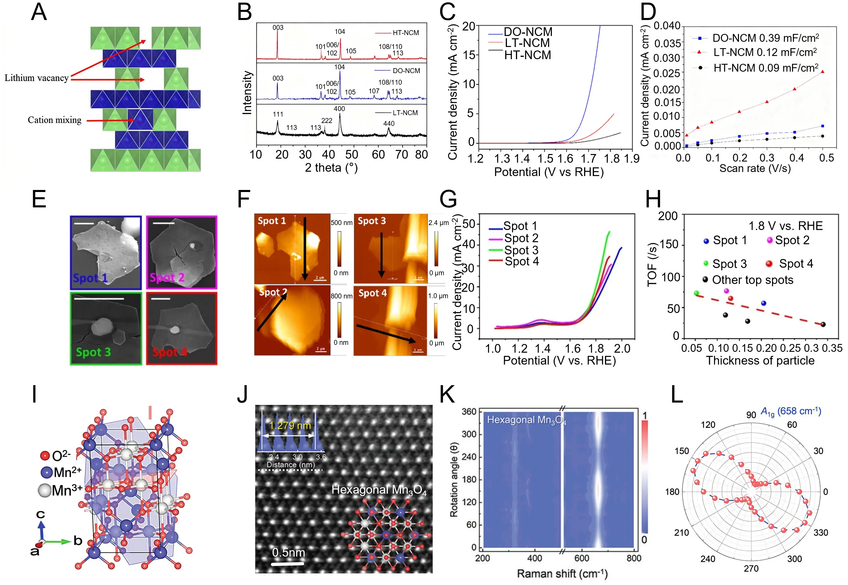 Figure 6. (a) Schematic illustration of cation mixing and lithium-vacancy defects in layered NCM structures; (b) XRD patterns of NCM samples showing the structural evolution associated with heat treatment and cation disorder; (c) LSV of LT-, HT-, and DO-NCM catalysts in 0.1 M KOH; (d) Scan-rate-dependent current responses of LT-, HT-, and DO-NCM electrodes, indicating different capacitive behaviors. Republished with permission from[165]; (e) SEM image of a single hexagonal Co3O4 particle analyzed by SECCM; (f) Cyclic-voltammogram responses at landing spots on particle surfaces and bare carbon; (g) SEM micrograph showing on-top droplet landing spots on the Co3O4 particle used for activity mapping; (h) Corresponding TOF values of the (111) top plane plotted against particle thickness. Republished with permission from[170]; (i) Schematic of the CVD growth of 2D tetragonal and hexagonal Mn3O4 nanosheets; (j) High-resolution TEM images revealing lattice arrangements and thickness of tetragonal and hexagonal Mn3O4 nanosheets; (k) Angle-dependent Raman spectra of hexagonal Mn3O4 showing crystallographic anisotropy; (l) Polar plot of the A1g Raman mode (658 cm-1) confirming the single-crystal symmetry of the Mn3O4 nanosheets. Republished with permission from[166]. LSV: linear-sweep voltammogram; HT: high temperature; LT: low temperature; SEM: scanning electron microscopy; TEM: transmission electron microscopy; SECCM: scanning electrochemical cell microscopy; XRD: X-ray diffraction; LSV: linear sweep voltammetry; TOF: turnover frequency; NCM: nickel-cobalt-manganese; DO: disordered oxide; CVD: chemical vapor deposition.
