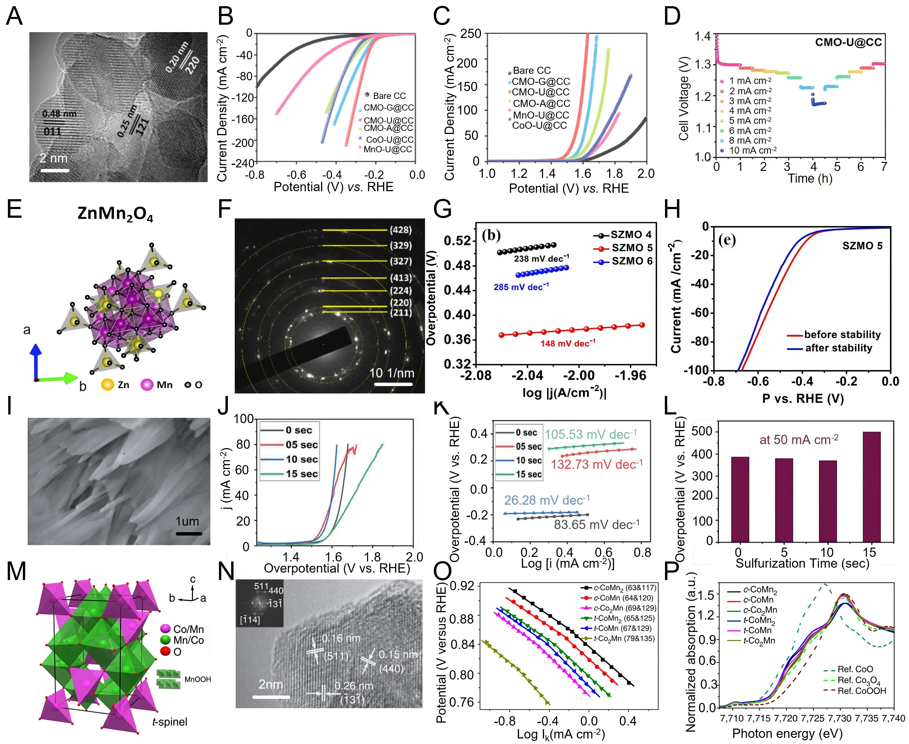 Figure 8. (a) High-resolution TEM image of CoMn2O4 showing lattice fringes assigned to the (011) and (200) planes; (b) LSVs of different Co–Mn oxide/CC electrodes in 1.0 M KOH; (c) Polarization curves of Co–Mn oxide electrocatalysts recorded in 1.0 M KOH; (d) Chronopotentiometry profile of CMO-U@CC at different current densities. Republished with permission from[210]; (e) Crystal model of tetragonal ZnMn2O4 showing Zn and Mn coordination within the spinel lattice; (f) SAED pattern of ZnMn2O4 with indexed diffraction rings; (g) Tafel plots derived from OER polarization curves of SZMO samples showing different Tafel slopes; (h) Linear-sweep voltammograms of SZMO before and after stability testing. Republished with permission from[211]; (i) SEM image showing nanosheet-assembled SZMO morphology; (j) Tafel plots of SZMO electrodes after different sulfurization times; (k) Tafel slope values extracted from polarization curves under different sulfurization durations; (l) Overpotential values of SZMO electrodes at 50 mA cm-2 after selected sulfurization times. Republished with permission from[220]; (m) Crystal model of t-spinel Co/Mn oxides showing octahedral coordination; (n) High-resolution TEM image showing lattice spacings of cubic and tetragonal Co–Mn oxide nanoparticles; (o) Tafel plots comparing electrocatalytic activity of cubic and tetragonal Co–Mn oxide phases; (p) X-ray absorption spectra at the Co K-edge revealing electronic structure differences between cubic and tetragonal Co–Mn oxides. Republished with permission from[209]. LSV: linear-sweep voltammogram; SAED: selected-area electron diffraction; OER: oxygen evolution reaction; TEM: transmission electron microscopy; SEM: scanning electron microscopy.