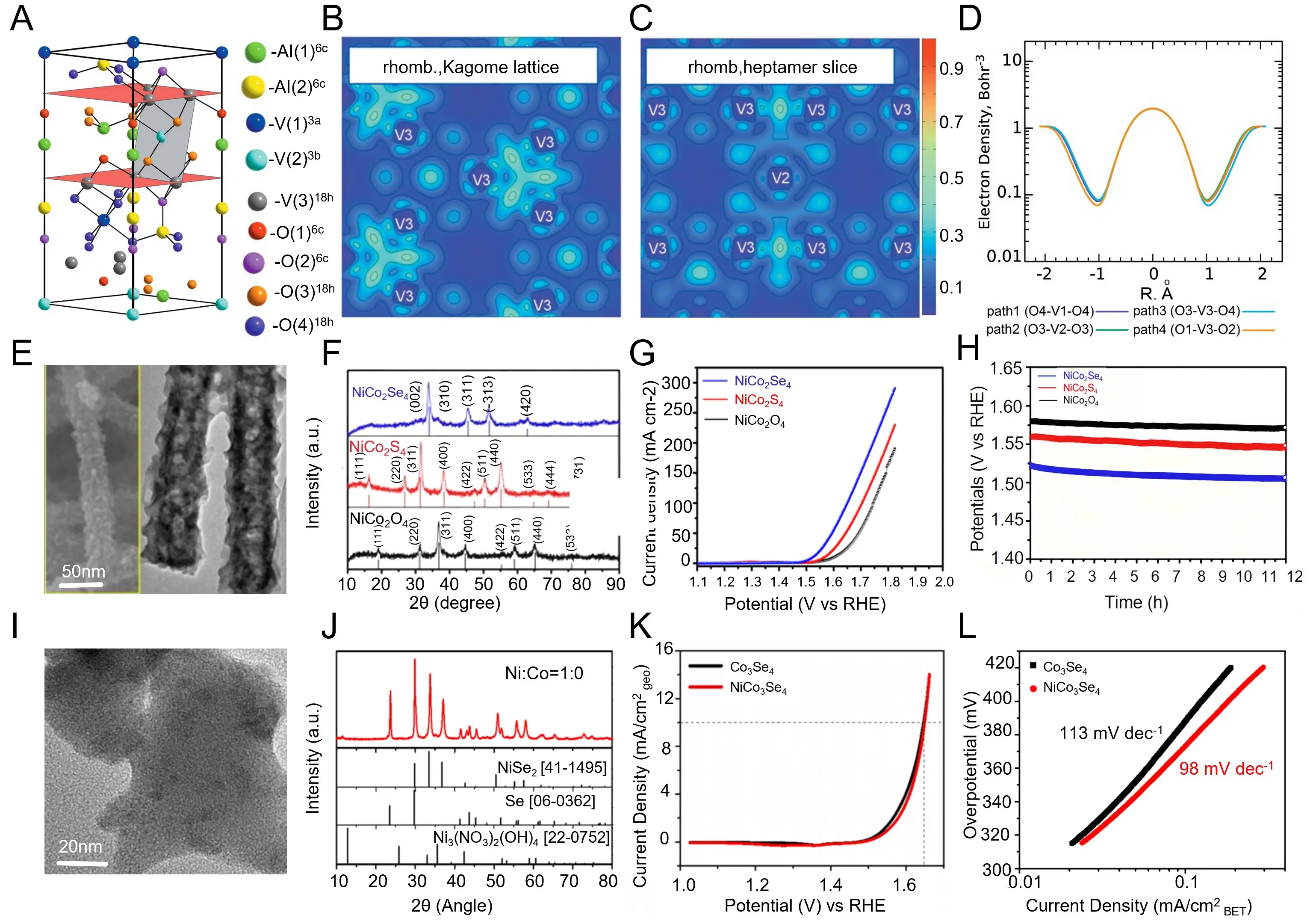 Figure 9. (a) Crystal structure of AlV2O4 showing the atomic positions of Al, V, and O in the spinel lattice; (b) ELF map showing the rhombohedral Kagome-like arrangement of V sites; (c) ELF slice showing heptamer-like V-site clustering under the rhombohedral distortion; (d) Line profiles of electron density along several V–O–V and V–V paths obtained from ELF analysis. Republished with permission from[221]; (e) SEM images of Ni, Co-based nanowires showing their one-dimensional morphology; (f) XRD patterns of NiCo2O4, NiCo2S4, and NiCo2Se4 showing the phase evolution after anion exchange; (g) Polarization curves comparing the OER performance of NiCo2O4, NiCo2S4, and NiCo2Se4 in 1 M KOH; (h) Polarization curves comparing OER activities of NiCo2O4, NiCo2S4 and NiCo2Se4 in 1 M KOH. Republished with permission from[213]; (i) HRTEM image of NiCo2Se4 showing nanoscale crystallinity; (j) XRD patterns of precursor Ni-Co selenide phases, including NiSe2 and associated intermediates; (k) OER polarization curves comparing NiCo2Se4 and Co3Se4; (l) Tafel plots and overpotential comparison of NiCo2Se4 and Co3Se4 measured in 1 M KOH. Republished with permission from[214]. ELF: electron localization function; OER: oxygen evolution reaction; SEM: scanning electron microscopy; XRD: X-ray diffraction; HRTEM: high-resolution transmission electron microscopy.