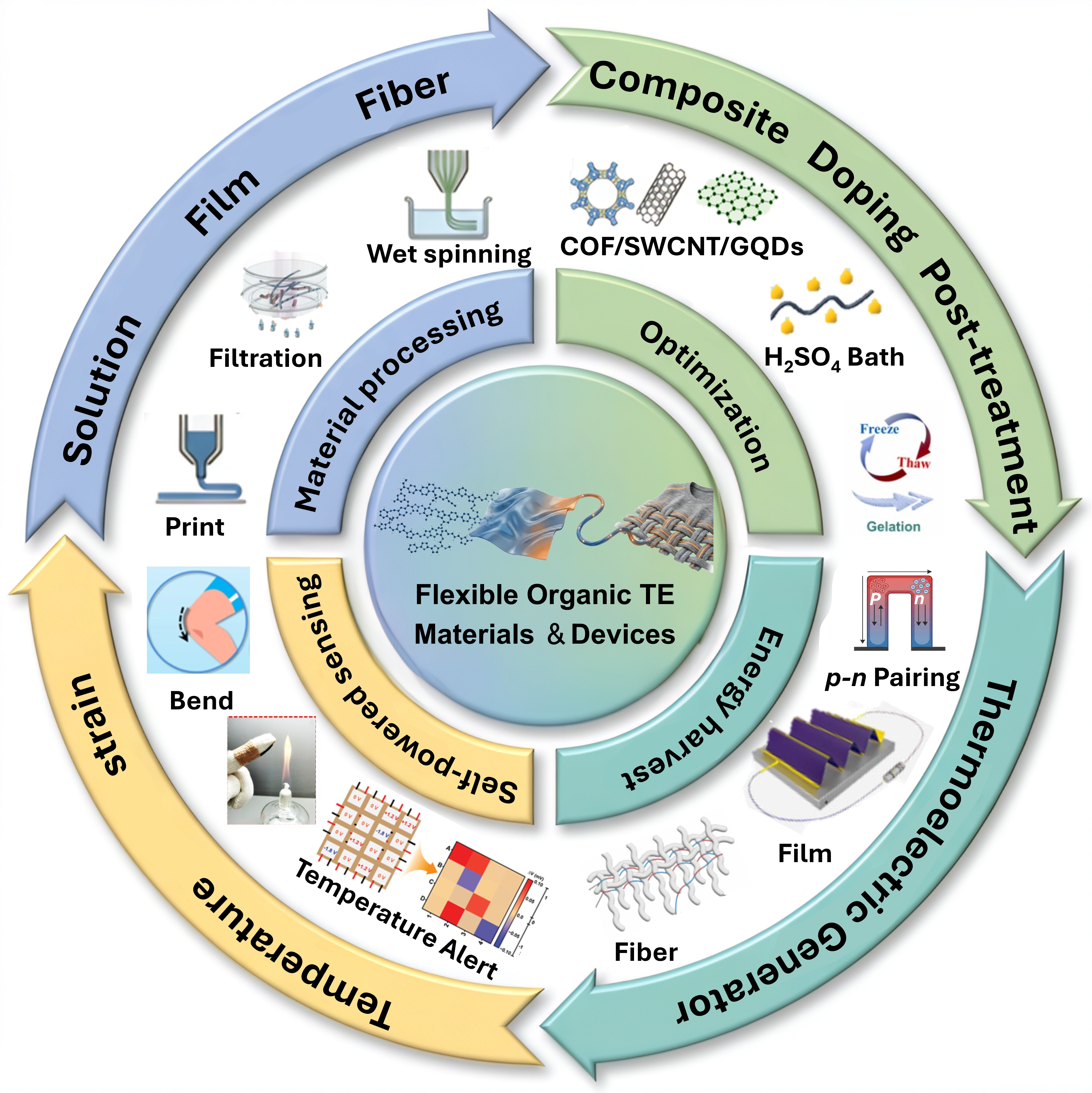 Figure 1. Fabrication and functionalization of flexible organic thermoelectric materials, and their multidimensional integration into applications. COF: covalent organic framework; SWCNT: single-walled carbon nanotube; GQDs: graphene quantum dots.
