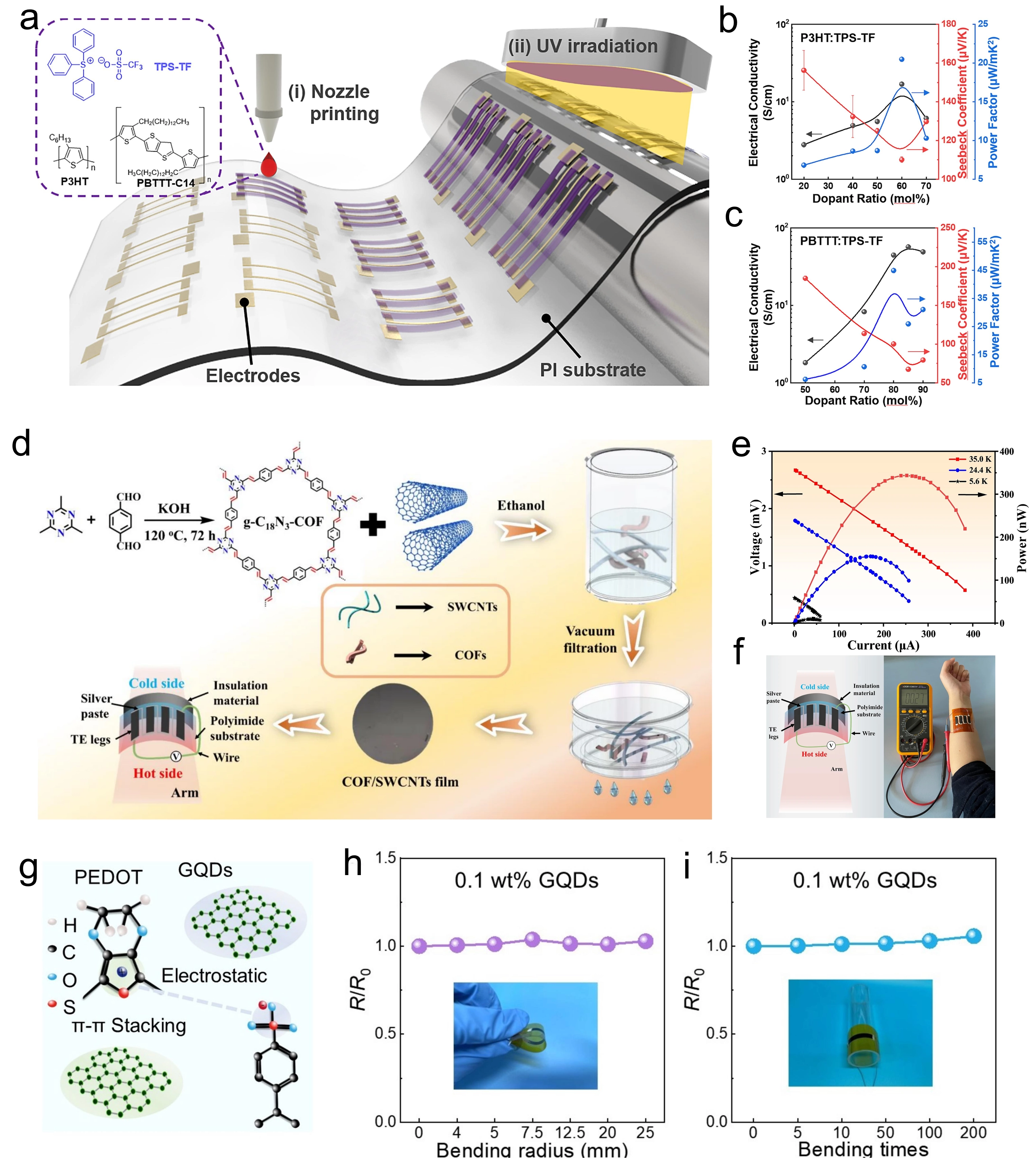 Figure 2. Flexible organic thermoelectric film material. (a) Schematic for the concepts of printed flexible OTEG module and chemical structures of the materials used; (b) Doped P3HT and (c) doped PBTTT films, as a function of the molar ratio of TPS-TF to polymer repeat unit (mol%). Republished with permission from[62]; (d) Schematic illustration of the preparation of g-C18N3-COF/SWCNTs composite films, and its corresponding f-TEGs; (e) Current dependence of the output voltage and power of g-C18N3-COF-30/SWCNTs f-TEG at different ΔT; (f) Schematic diagram and digital photo of the output performance for g-C18N3-COF-30/SWCNTs f-TEG. Republished with permission from[73]; (g)Structure diagram of PEDOT:PSS and GQDs; (h) Normalized resistance (R/R0) of 0.1 wt% GQDs-incorporated PEDOT: PSS film as a function of bending radius. The inset shows a photograph of the flexible film being bent; (i) R/R0 of the same film as a function of bending cycles. The inset displays a photograph of the film enduring repeated bending[74]. OTEG: organic thermoelectric generator; PBTTT: poly[2,5-bis(3-tetradecylthiophen-2-yl)thieno[3,2-b]thiophene]; SWCNTs: single-walled carbon nanotubes; PEDOT: poly(3,4-ethylenedioxythiophene); PSS: poly(styrene sulfonate); GQDs: graphene quantum dots; COFs: covalent organic frameworks; TEG: thermoelectric generators; P3HT: poly(3-hexylthiophene).