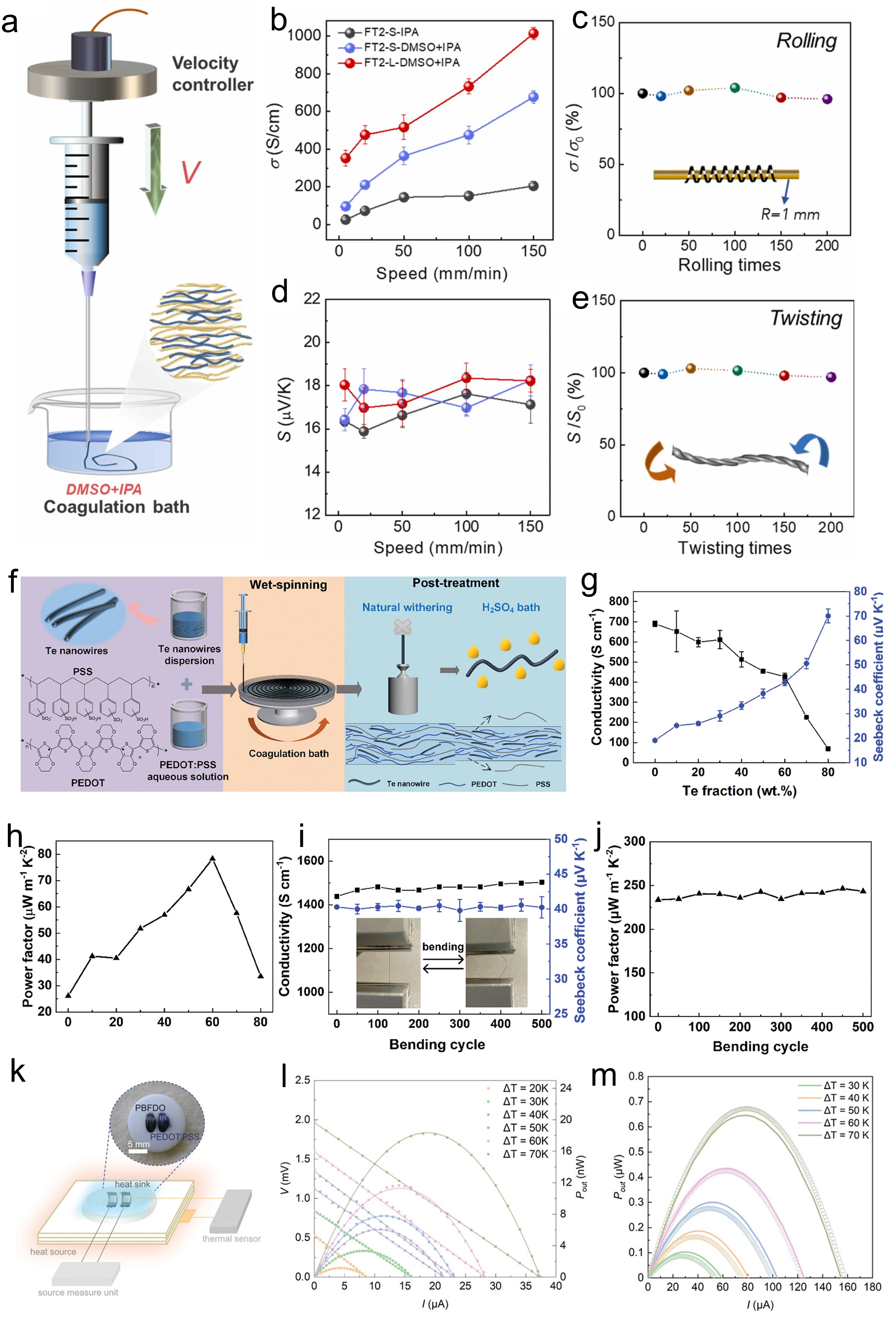 PEDOT:PSS-based fibers illustrate how processing and structure can be co-optimized to meet these constraints. One representative strategy combines freeze-thaw (FT) induced sol-gel transition with high-speed continuous wet spinning to improve spinnability and fiber quality (Figure 3a). By optimizing FT cycle number, extrusion speed, needle aspect ratio, and coagulation bath composition, the resulting fibers exhibit uniform one-dimensional morphologies and enhanced chain ordering. Electrical conductivities up to approximately 103 S cm-1 have been achieved, representing a 2-10-fold improvement over most previously reported wet-spun PEDOT:PSS TE fibers (Figure 3b)[82]. This enhancement is attributed to FT-driven rheological regulation, more effective charge transport under one-dimensional confinement, and partial removal of insulating PSS in the DMSO/IPA coagulation system. The process is also associated with a PEDOT conformational transition from benzoid to quinoid structures[84]. The electrical conductivity (σ) remains nearly unchanged after multiple rolling cycles (Figure 3c), while the Seebeck coefficient (S) shows negligible dependence on spinning speed (Figure 3d) and is essentially retained even after 200 repeated twisting cycles (Figure 3e). These results indicate that the fibers maintain stable σ and S under continuous mechanical deformation such as bending and twisting, achieving a maximum power factor of up to 34 μW·m-1 K-2, along with strong thermoelectric performance stability and mechanical reliability.
