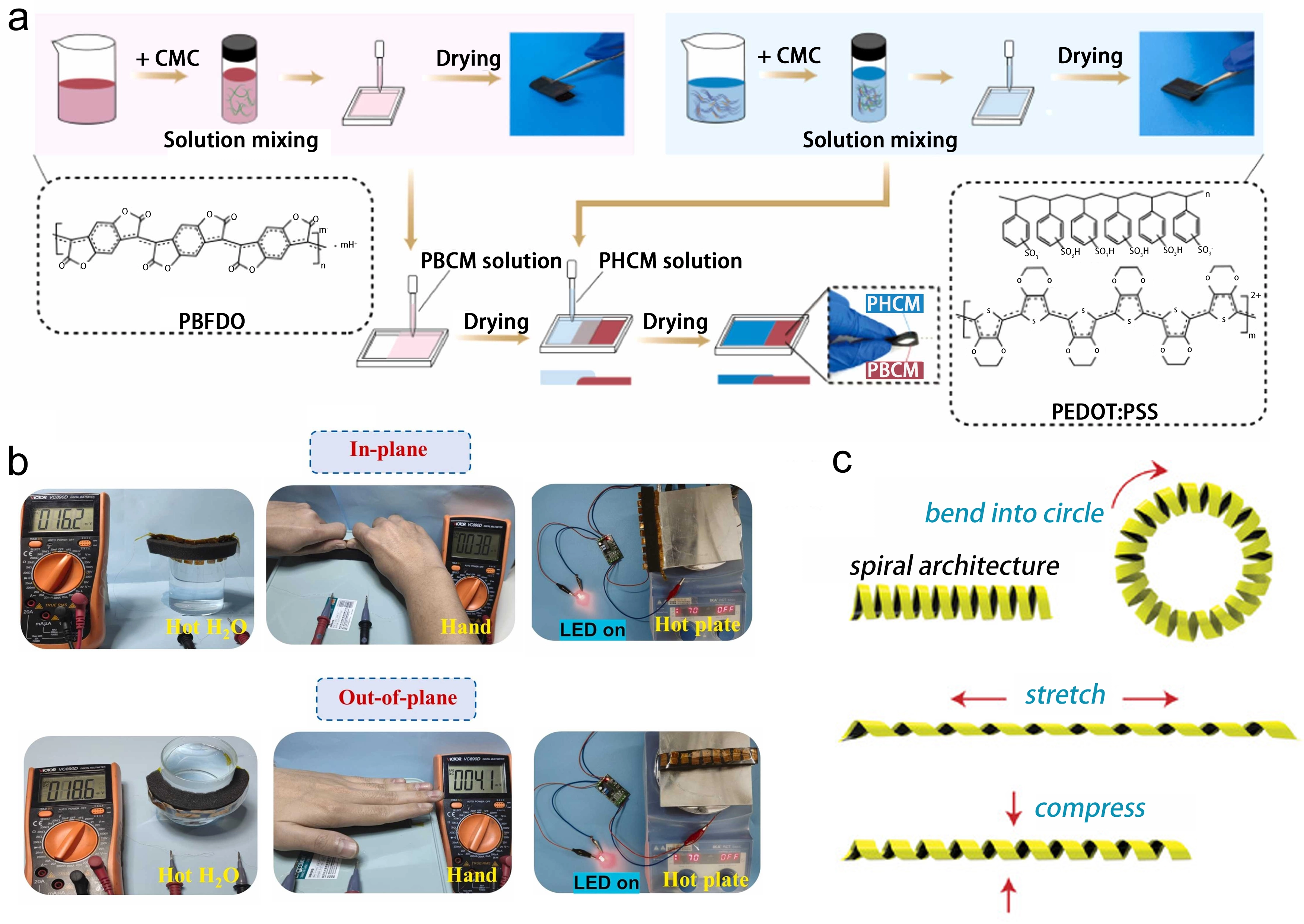 Figure 4. (a) The process flow of PEDOT:PSS, PBFDO and composite film. Republished with permission from[92]; (b) The potential applications for the TEG-10pn with tunable in-plane and out-of-plane architecture to utilize the temperature difference induced by hot water, human body or hot plate. Republished with permission from[93]; (c) The flexible TEGs that can be bent, stretched, and compressed. Republished with permission from[94]. PEDOT: poly(3,4-ethylenedioxythiophene); PSS: poly(styrene sulfonate); PBFDO: poly(benzodifurandione); TEG: thermoelectric generator; CMC: carboxymethyl cellulose.