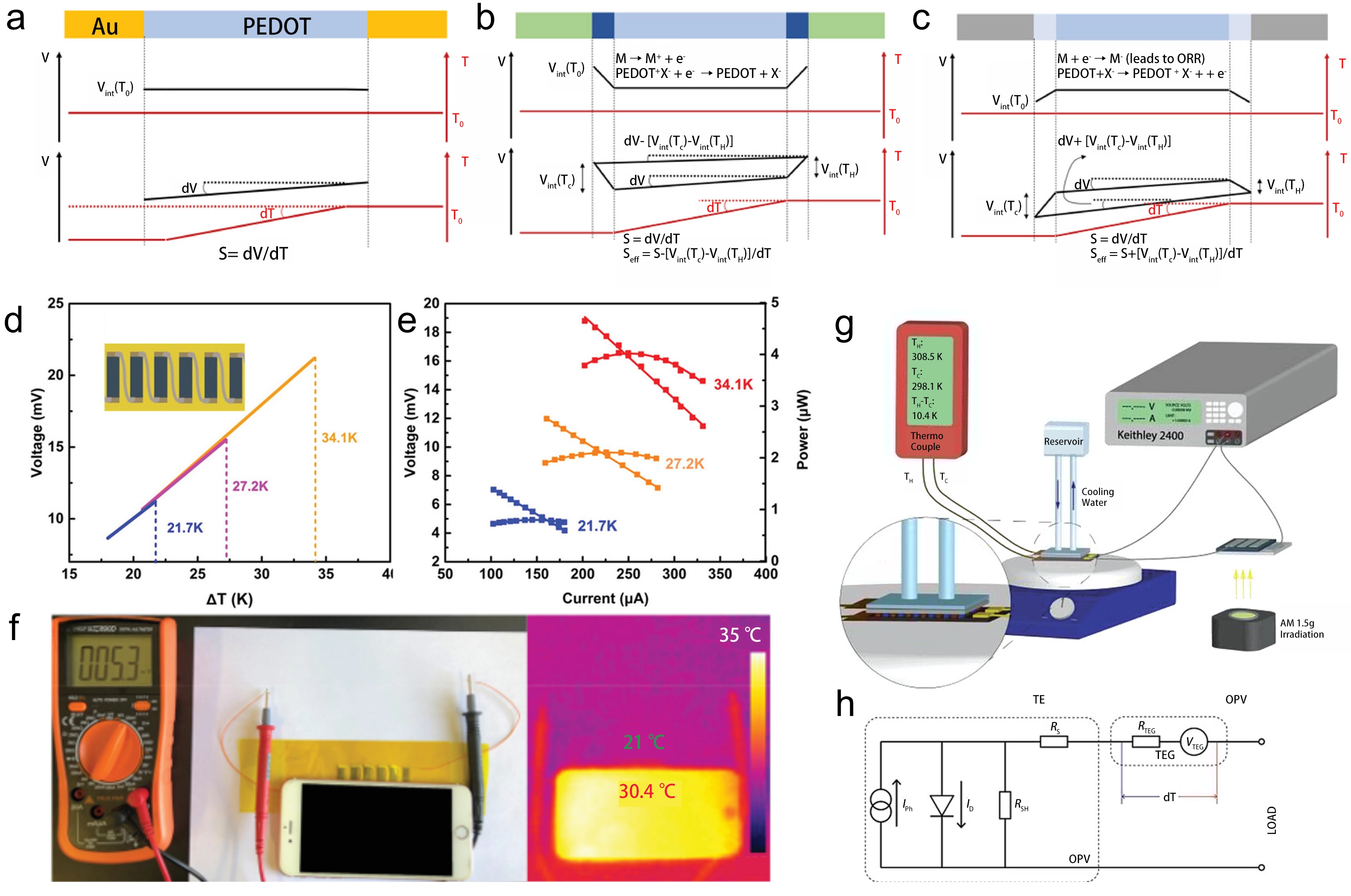 Figure 5. Interfacial effect in the measurement of thermovotlage and Seebeck coefficient. A schematic representation on the effect of polymer/metal energetics on the measured Seebeck coefficient. (a) When PEDOT is in contact with a metal with equal work function; (b) with a lower work function metal, and (c) with a higher work function metal. Performance of the six-leg f-TEG fabricated with the AP1[95]; (d) Open-circuit voltage at different temperature gradients (the inset is a diagrammatic sketch of the f-TEG); (e) The output voltage and power versus current at different ΔT; (f) A digital photo of 5.3 mV voltage created from the ΔT between a mobile phone that has just finished running a game program and the ambient (right side is the corresponding infrared thermal image). Republished with permission from[96]; (g) Illustration of the test platform for the integrated device; (h) Equivalent circuit for the integrated device. Republished with permission from[97]. PEDOT: poly(3,4-ethylenedioxythiophene); TEG: thermoelectric generator.
