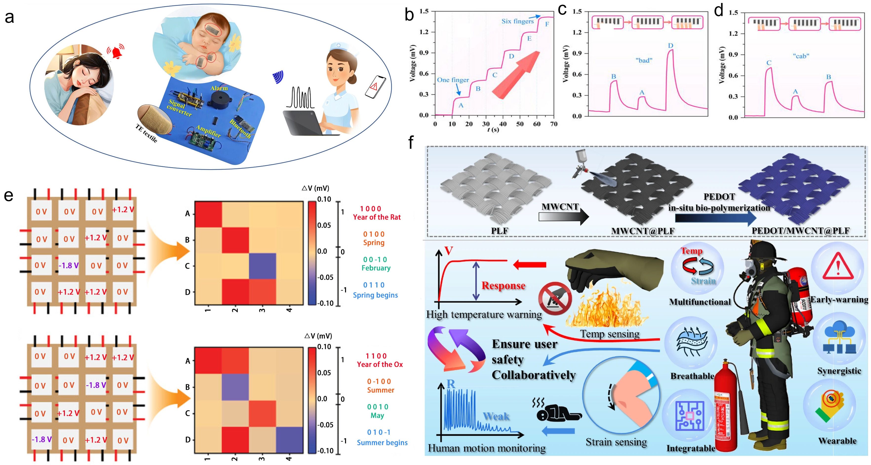 Figure 6. (a) TE fabric-based self-powered smart remote human body fever warning system. Schematic diagram of wearable TE fabric for intelligent monitoring and warning of children’s body temperature. Republished with permission from[2]; (b) V generated by touching one to six fingers corresponding to the self-powered temperature sensor. The self-powered temperature sensor converts the V generated by ΔT into words, taking (c) bad and (d) cad as examples. Republished with permission from[101]; (e) 2D voltage heat maps obtained by ΔV (the voltage difference between the 30th and 5ths) to demonstrate the decoded information. To avoid experimental errors, ΔV < -0.015, -0.015 to 0.015 mV, and > 0.015 mV are considered as -1, 0, 1, respectively. Republished with permission from[102]; (f) Preparation of the rapid response, stretchability, flexibility, and permeability thermoelectric fabric and its application in self-powered health anomaly and temperature threshold warning performance[50]. PLF: porous layered fabric; MWCNT: multi-walled carbon nanotube; PEDOT: poly(3,4-ethylenedioxythiophene); TE: thermoelectric.