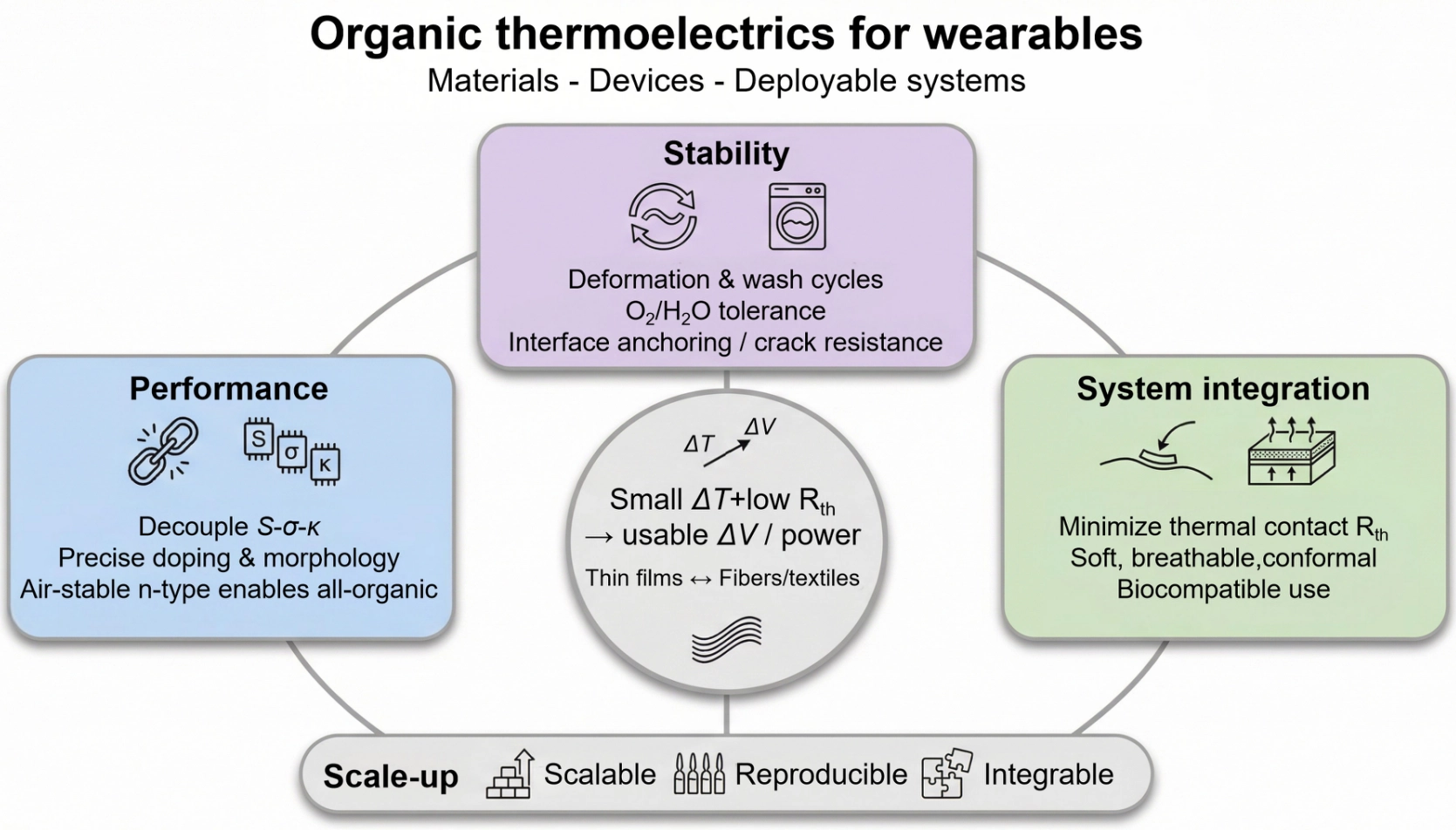 Mitigating this coupling remains a central challenge. Promising directions include energy dependent carrier filtering to raise the average carrier energy, backbone and side chain designs that further suppress κL through enhanced low frequency vibrational scattering, and organic inorganic hybrid architectures that selectively scatter phonons while preserving electronic transport. For wearables, numerical ZT alone does not capture practical merit. Ultralow κ and mechanical softness enable organic thermoelectrics to harvest energy from minute temperature differences around 1 to 5 K, while conformal skin contact can reduce interfacial thermal resistance. In this context, performance is best evaluated within a material, device, application framework that reflects real operating conditions rather than peak material metrics in isolation.