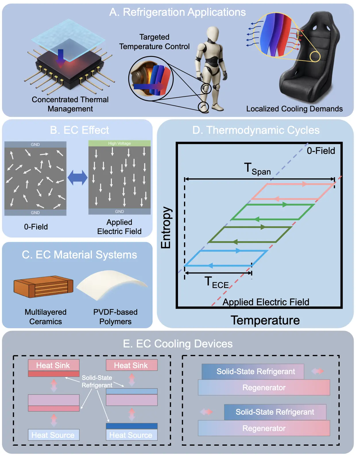 Refrigeration has quietly transformed nearly every aspect of modern technology over the last two hundred years. The future advancement of science and technology and the goal of continuous improvement of human living standards, demand the technical leap of localized and targeted active thermal management[1]. These ever demanding callsstimulate new urges for the innovation of refrigeration technology as illustrated in Figure 1A. For instance, high-performance chips require precise cooling during operation, as excessive heat can reduce computational performance. Similarly, the local heat generated by active joints in complex machinery, such as robots, requires precise heat dissipation on motors, actuators, power electronics, and etc. Compared with large open-space air conditioning (A/C), localized cooling in specific areas, such as room seats or car seats, can offer comfortable temperature regulation for humans with lower energy consumption than that of current central A/C systems. Although the widely commercialized vapor-compression refrigeration technology and thermoelectric coolers can be adapted for localized applications under proper design considerations, solid-state cooling technologies, including magnetocaloric (MC)[2-4], elastocaloric (eC)[5-8], electrocaloric (EC)[9-11], barocaloric (BC)[12-14], and thermoelectric[15,16] technologies, provide alternative technology solutions that address requirements such as system compactness, portability, noise-free, and reduced greenhouse gas emissions. Among these, EC cooling technology, based on the EC effect (ECE), has attracted widespread attention from academia and industrial world in recent years.