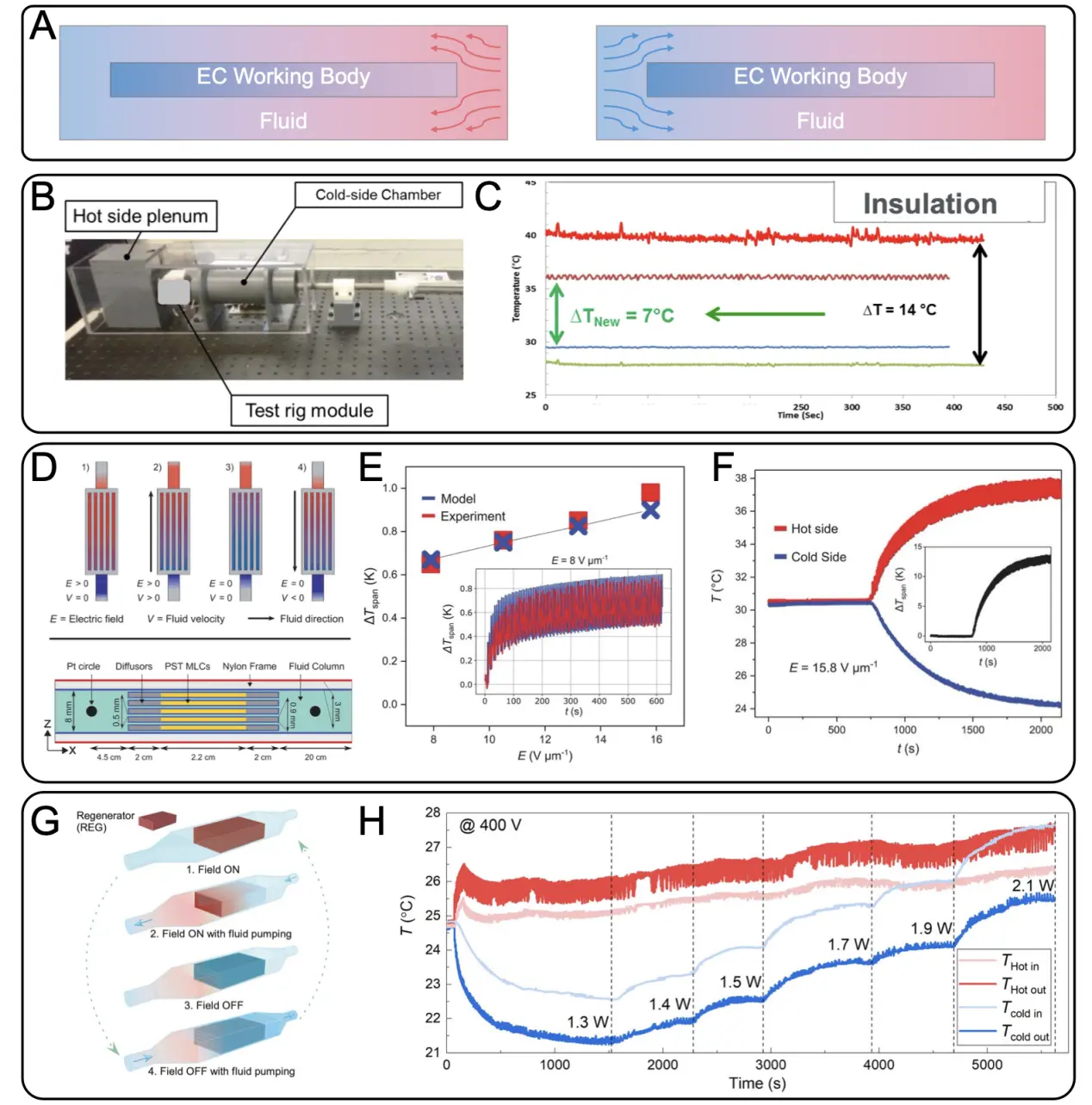 Figure 3. Active EC regenerative devices with fluidic regenerators. (A) Working principles for AER devices with liquids working as regenerators; (B) AER device employing air as the regenerating medium, fabricated at UTRC, exhibiting a temperature decrease of approximately 14 K. Republished with permission from[68]; (C) Temperature response of the device; (D) Design of the PST MLC device based on heat transfer with a fluidic regenerator; (E) Achieved temperature spans under various electric fields; (F) Temperature changes of the hot and cold sides with time at 15.8 V·µm-1. Republished with permission from[69]; (G) Double-loop-based EC cooling device with PST MLCs, showing regenerators with terminals outside (REG-TO) and terminals inside (REG-TI); (H) Changes in temperature at the hot and cold ends with increasing heater power input. Republished with permission from[11]. EC: electrocaloric; AER: active electrocaloric regenerator; PST: PbSc0.5Ta0.5O3; MLC: multilayer capacitor; UTRC: United Technologies Research Center; REG-TO: regenerator with terminals outside; REG-TI: regenerator with terminals inside.