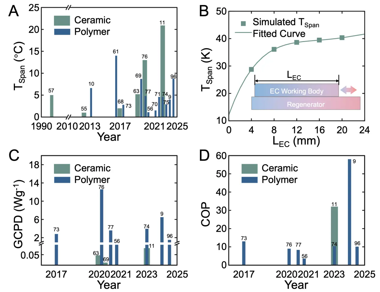 Figure 6. Cooling abilities of reported EC cooling devices. (A) TSpan values of various EC cooling devices with ceramic and polymeric refrigerants; (B) Increase in the TSpan of the EC cooling device comes larger with increased EC working body lengths; (C) GCPD of EC cooling devices with ceramic and polymeric refrigerants, calculated considering only the mass of the effective EC working body; (D) COP of EC cooling devices with ceramic and polymeric refrigerants, where the operating TSpan varies across the different cases. EC: electrocaloric; TSpan: temperature span; GCPD: general cooling power density; COP: coefficient of performance.