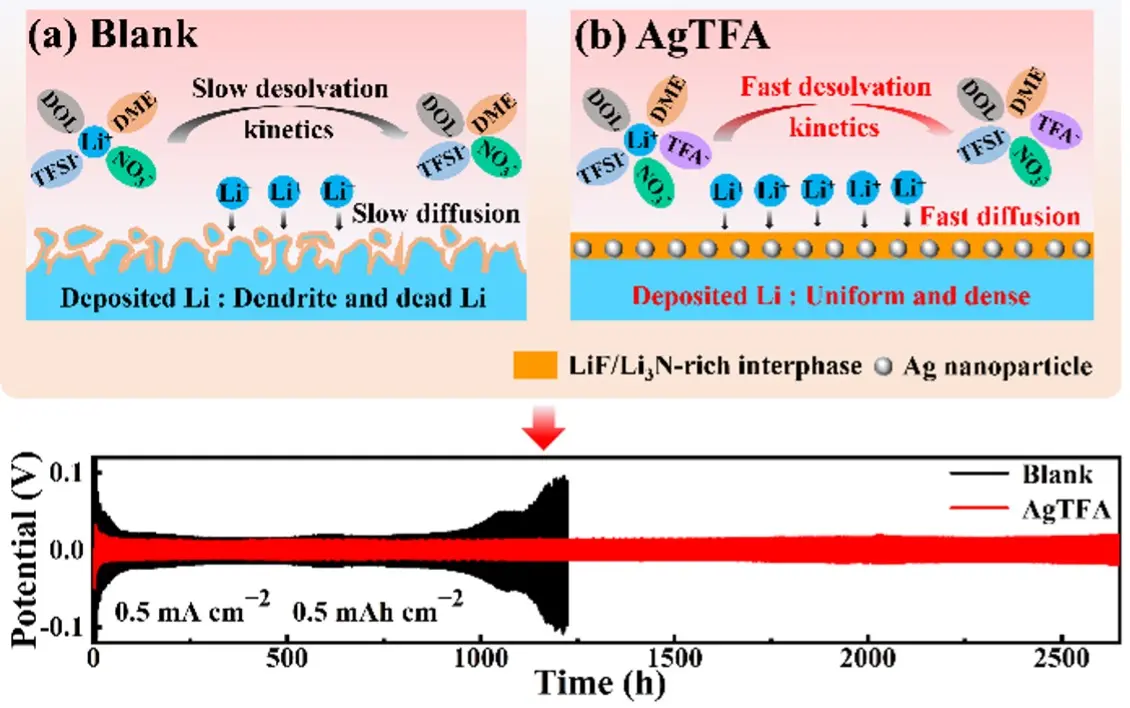 MoreLithium (Li) metal, owing to its high theoretical specific capacity and low electrochemical potential, is considered one of the most promising anode materials for next-generation rechargeable batteries. However, interfacial instability severely hinders the practical application of Li anodes. Constructing a robust solid electrolyte interphase (SEI) with optimized chemical composition and structure has been recognized as an effective strategy to overcome this challenge. Here, we propose silver trifluoroacetate (AgTFA) as a multifunctional electrolyte additive that synergistically regulates Li nucleation and promotes the formation of an anion-rich solvation structure. Through a spontaneous in situ displacement reaction, uniformly distributed silver nanoparticles (Ag NPs) are generated on the Li surface, providing abundant lithiophilic nucleation sites to enable homogeneous Li deposition. Meanwhile, trifluoroacetate anions (TFA-) with an ultrahigh donor number, together with NO3- anions participating in Li+ solvation, markedly reduce the desolvation barrier and facilitate the formation of a LiF-Li3N-rich SEI. As a result, Li||Li symmetric cells exhibit remarkable cycling stability of up to 2,500 hours at 0.5 mA·cm-2/0.5 mAh·cm-2, while Li||LiFePO4 full cells deliver a high discharge capacity of 139.8 mAh·g-1 with an excellent capacity retention of 97.28% after 200 cycles at 1.0 C. This work demonstrates a feasible strategy for constructing durable SEI layers by coupling Li nucleation regulation with anion-rich solvation chemistry.