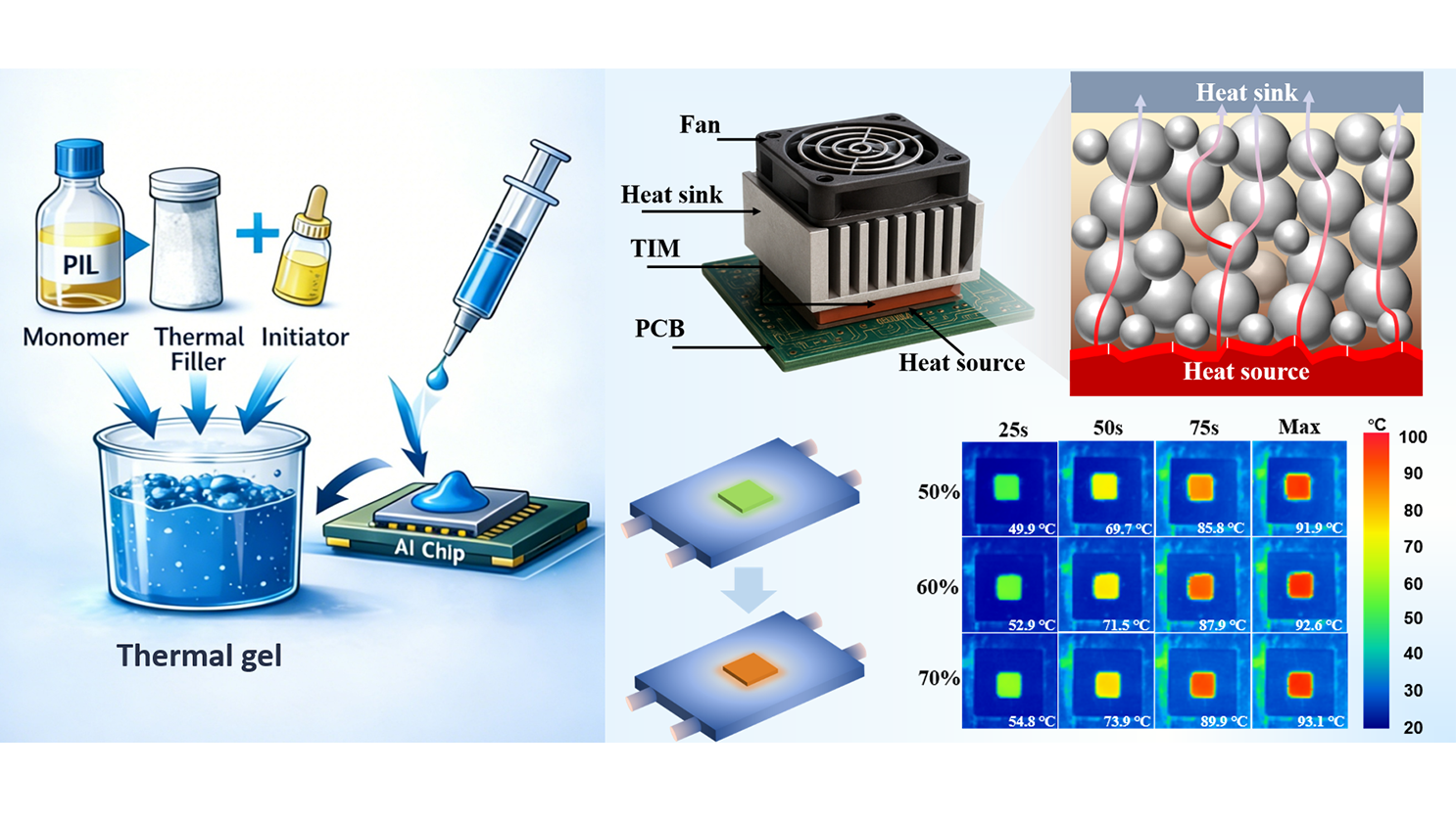 MoreThe increasing die size, package dimensions and operating heat flux of AI chips impose stringent requirements on the mechanical compliance and reliability of chip-level thermal interface materials (TIMs). Polymer-based TIMs, particularly silicone gels, offer advantages such as mechanical flexibility, automated dispensability, and warpage accommodation in large packages; however, their application is limited by weak interfacial adhesion and siloxane volatilization. Therefore, it is essential to develop advanced non-silicone thermal gels. This study reports a poly(ionic liquid) (PIL)-based thermally gel TIM. The TIM was fabricated by dispensing a mixture of ionic liquid monomer, Al2O3 thermal filler, and initiator, followed by thermal curing, making it compatible with FCBGA dispensing processes (the viscosity before curing was 225 Pa·s). With 70 vol% Al2O3 filler, the PIL-based TIM exhibited a low storage modulus of 255 kPa and high interfacial adhesion strengths of 0.95 MPa to Cu and 0.91 MPa to Si. The intrinsic thermal resistance reached 2.4 × 10-5 m2·K/W, comparable to that of conventional silicone systems. Notably, the interfacial contact thermal resistance with Si (Rc = 1.95 ± 0.87 × 10-7 m2·K/W) was an order of magnitude lower than that of silicone-based TIMs. Reliability tests showed > 98% coverage after three accelerated aging tests, with no leakage or volatilization. The proof-of-concept study validates the feasibility of PIL-based TIMs and highlights their significant potential for further optimization in next-generation AI thermal management.