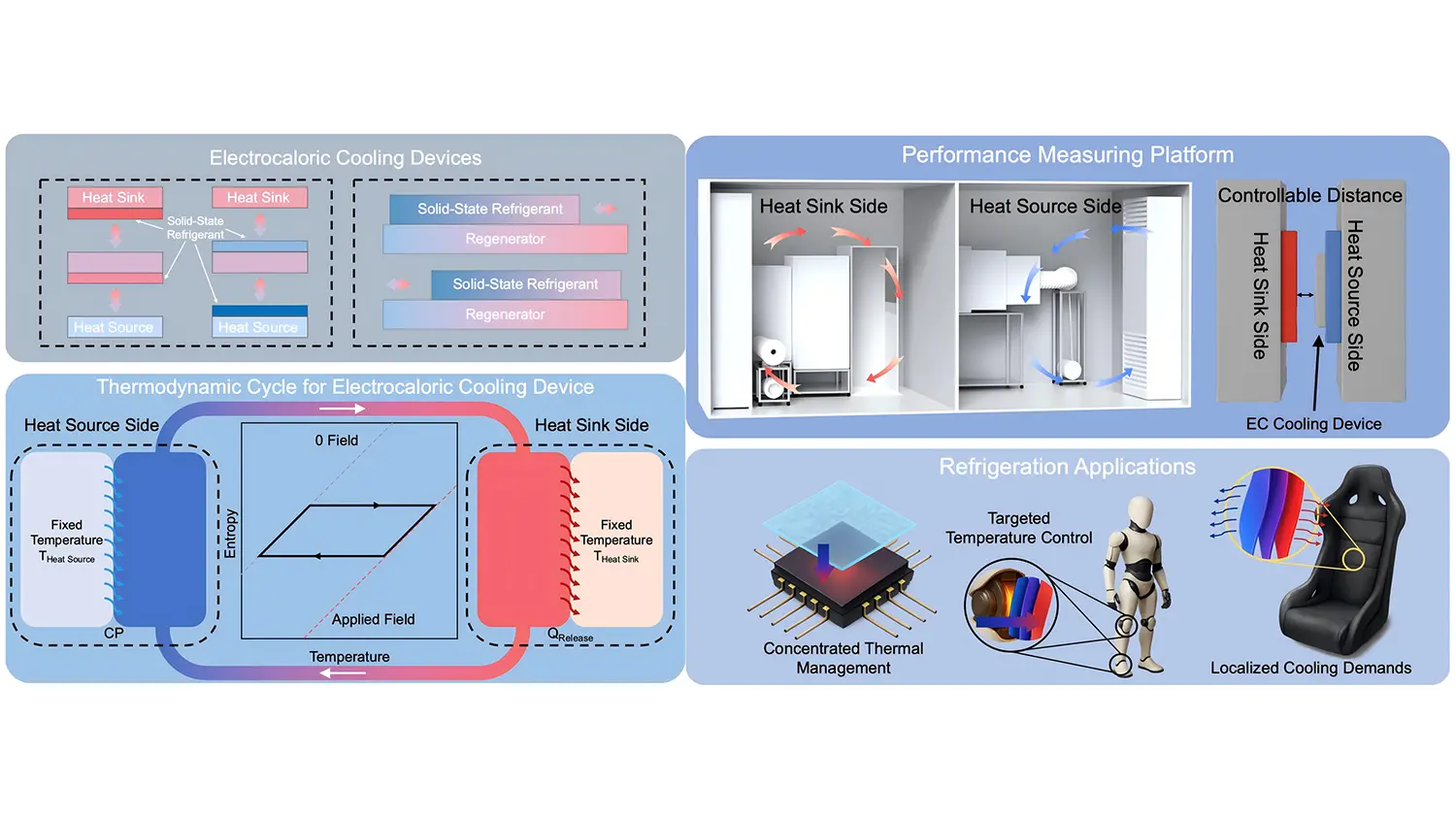 MoreThe electrocaloric (EC) effect represents the changes of polarization entropy and/or temperature of dielectrics when an external electric field is applied and removed. An efficient EC effect relies on a highly reversible conversion between electrical energy and thermal energy. Based on this effect, EC refrigeration has demonstrated advantages in terms of high energy efficiency, zero direct carbon emissions, and high specific volumetric cooling power densities. Consequently, EC refrigeration is recognized as one of the promising alternative technologies for next-generation refrigeration and heat pump. Over the past two decades, EC cooling devices have been extensively developed, driven by advances in EC materials and working bodies. In this review, we summarize recent progress in EC cooling devices, focusing on the mechanisms of solid-state refrigerants and thermodynamic cycles within these systems, and highlighting the characteristics of devices operating on different working principles.