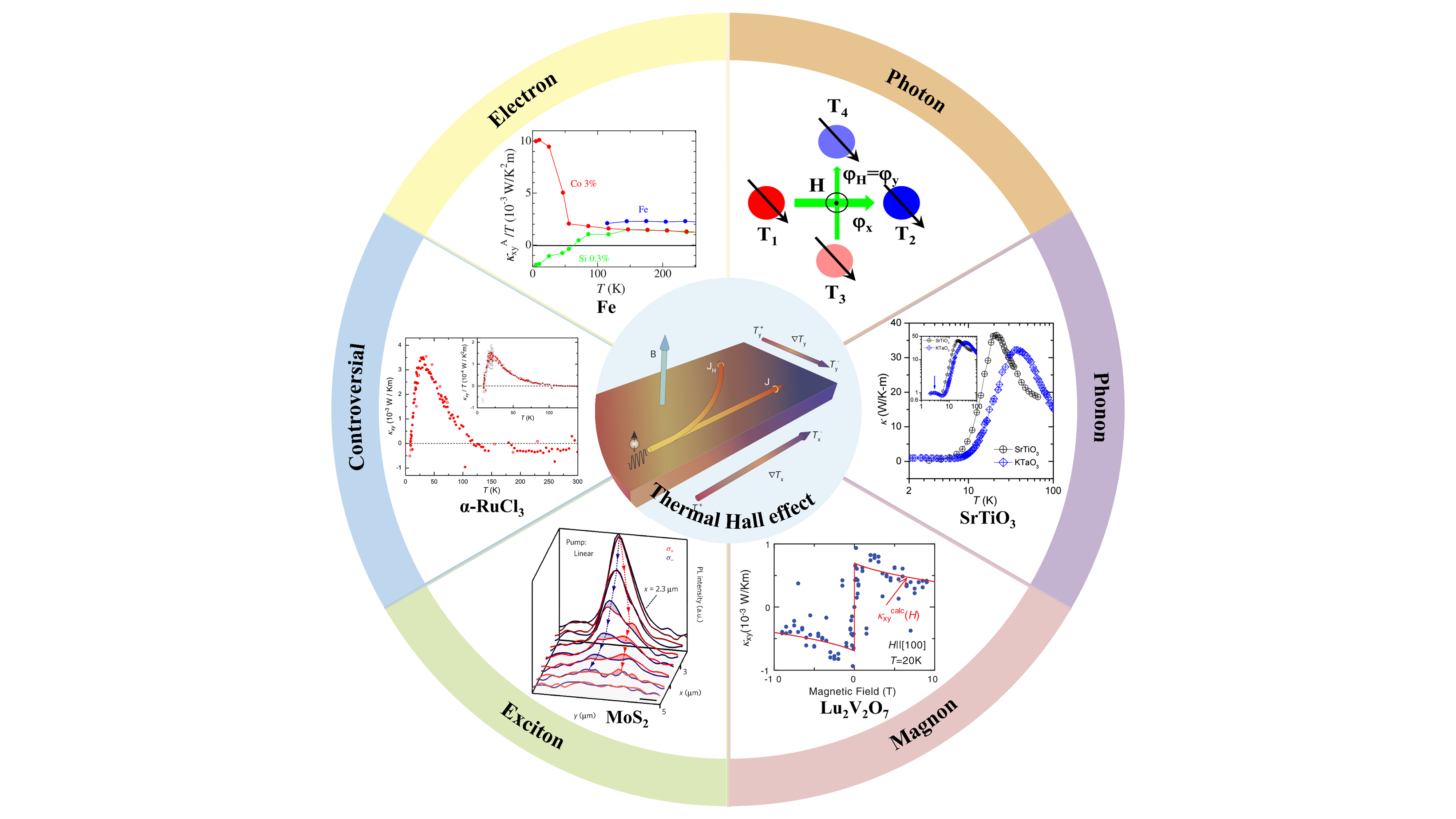 MoreThermal Hall effect (THE) refers to the phenomenon whereby, in a magnetic field, when a longitudinal heat current flows through a material, the heat carriers are deflected, thereby generating a transverse temperature difference between the two lateral edges. The transition from electrical to thermal transport enables this effect to involve a wide range of carriers, thereby providing a unique perspective for investigating complex quantum states in condensed matter physics. THE is increasingly becoming a powerful probe of neutral excitations in materials and is used to explore multifield control phenomena in magneto-thermal-electrical coupled systems. Advances in the field of THE have significantly advanced the study of condensed matter systems under extreme conditions (low temperatures and strong magnetic fields) and have laid the groundwork for exploring novel magneto-thermal-electrical effects in quantum materials. This review systematically reviews recent theoretical and experimental progress on THE, with particular attention to the underlying heat carriers. Through an in-depth analysis of the transport mechanisms of different carriers, quantum material systems that can be used to investigate multicarrier coupled transport are identified, which will significantly facilitate the synergistic control of magneto-thermal-electrical transport in complex interacting systems. Finally, we propose a novel in situ, multiparameter integrated characterization method that enables simultaneous and precise measurement of magnetic, thermal, and electrical parameters on the same micro/nanoscale samples. This approach not only overcomes the limitations of bulk materials but also serves as a key experimental platform for revealing the mechanisms of multicarrier coupled transport in micro/nano samples.
