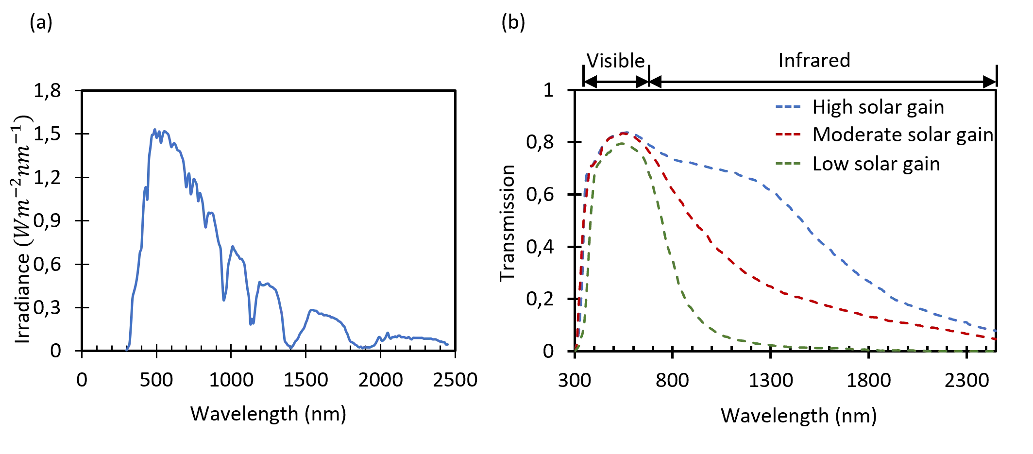 Since the angular resolution of the Tensor Tree BSDFs used is limited to 2.53°, this implies that the results may deviate slightly from the achievable optimum. However, they should be sufficiently accurate to show the achievable effects in the model room. Since both optical and thermal simulation model of the micromirror array has to be created, which can describe the behavior over the relevant wavelength range from 400 nm to 2,500 nm of the electromagnetic spectrum, the geometrical models additionally require an assignment of realistic material properties of the micromirror array. For this purpose, the reflection and transmission spectra of the micromirror metallic stack are determined via the open-source software OpenFilters[88] by modelling the multilayer system of the micromirrors to obtain the required values for the material assignment. As expected, the transmission spectrum of the metals is nearly zero over the considered wavelength range, as shown in Figure 8. The reflection shows a profile that is characteristic of aluminum. Subsequently, the colorimetric properties of the metallic layer system for a correct color rendering of the reflected light are determined by standardized colorimetric methods using the CIE standard illuminant D65, the CIE standard observer CIE-1931 and the reflection spectrum of the layer system using OpenFilters. The calculated L*a*b* color values can be converted to equivalent RGB color values that can be processed by Radiance. For the sake of simplicity, the layers of FTO and silicon dioxide are neglected in the description of the material properties. The specularity and roughness values were assumed to be optimum according to the high-quality technological processes used to fabricate the layers.