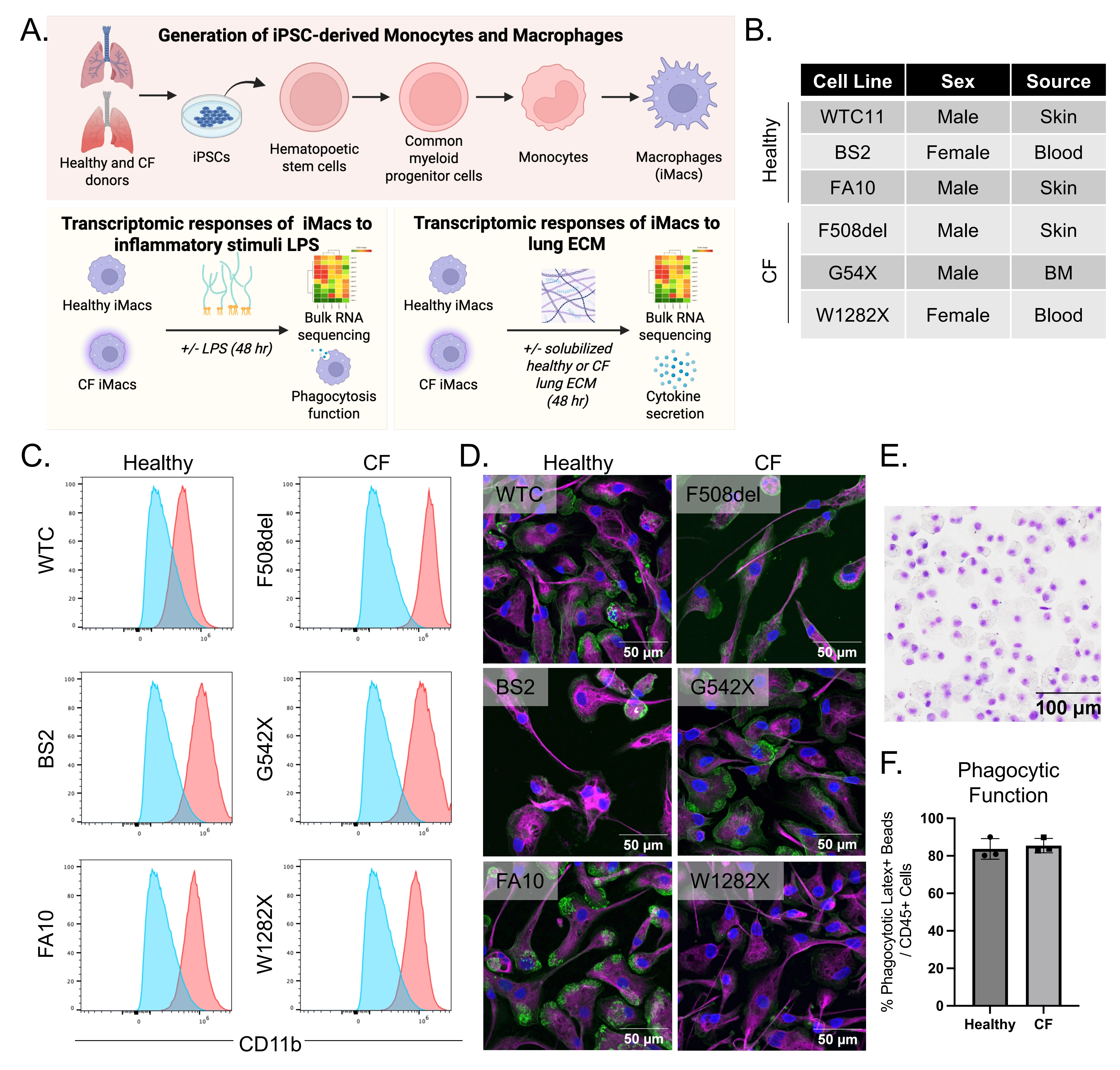 Figure 1. Overview of experimental strategy and derivation of iPSC-derived macrophages (iM0) from healthy and CF donors. (A) Schematic representation of experimental goals; (B) Table of iPSC lines from healthy and CF donors used in the study; (C) CD11b+ flow cytometry profiles of healthy and CF iPSC-derived CD14+ iM0 (red is each donor; blue is the negative control); (D) Immunofluorescent staining of healthy and CF iM0 for CD68 (magenta), phalloidin (green) and nuclei (DAPI), attached on FBS-coated glass cover slips; (E) Example Giemsa-Wright staining showing morphology of cytospun CF iM0; (F) Phagocytic functions of healthy and CF iM0 using phagocytosis of Latex+ microbeads. Created in BioRender.com. CF: cystic fibrosis; DAPI: 4′,6-diamidino-2-phenylindole.