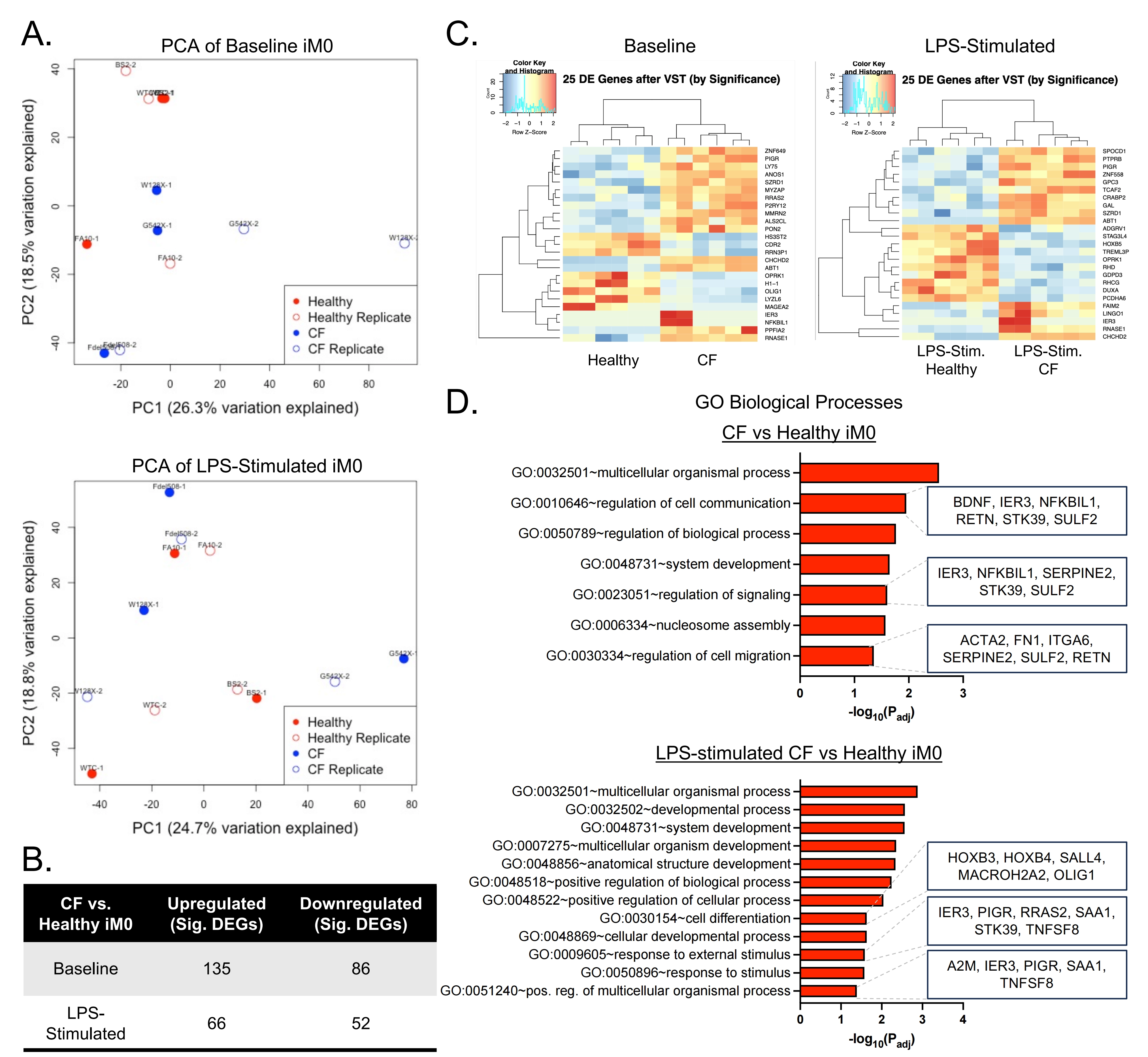Figure 2. Transcriptomic differences between iM0 derived from healthy (n = 3) and CF donors (n = 3), with and without LPS stimulation. (A) Principal component analysis of patient-derived iM0 at baseline and in response to LPS showing patient-specific clustering; (B) Comparison of significant differentially expressed genes between groups;