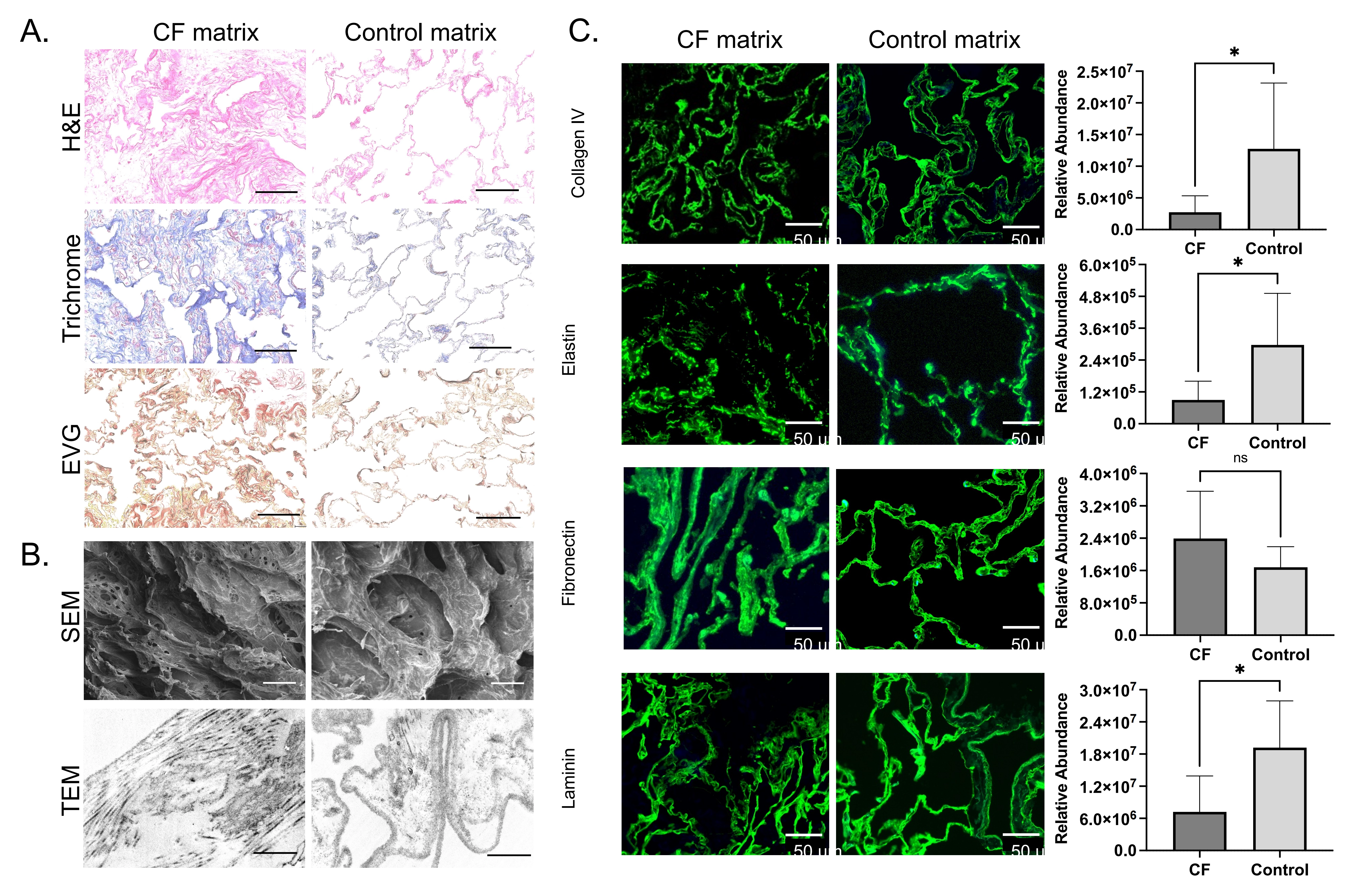 Figure 3. Cystic fibrosis and control lung ECM biomaterials composition and ultrastructure. CF and control lung ECM biomaterials comparison with (A) histology including