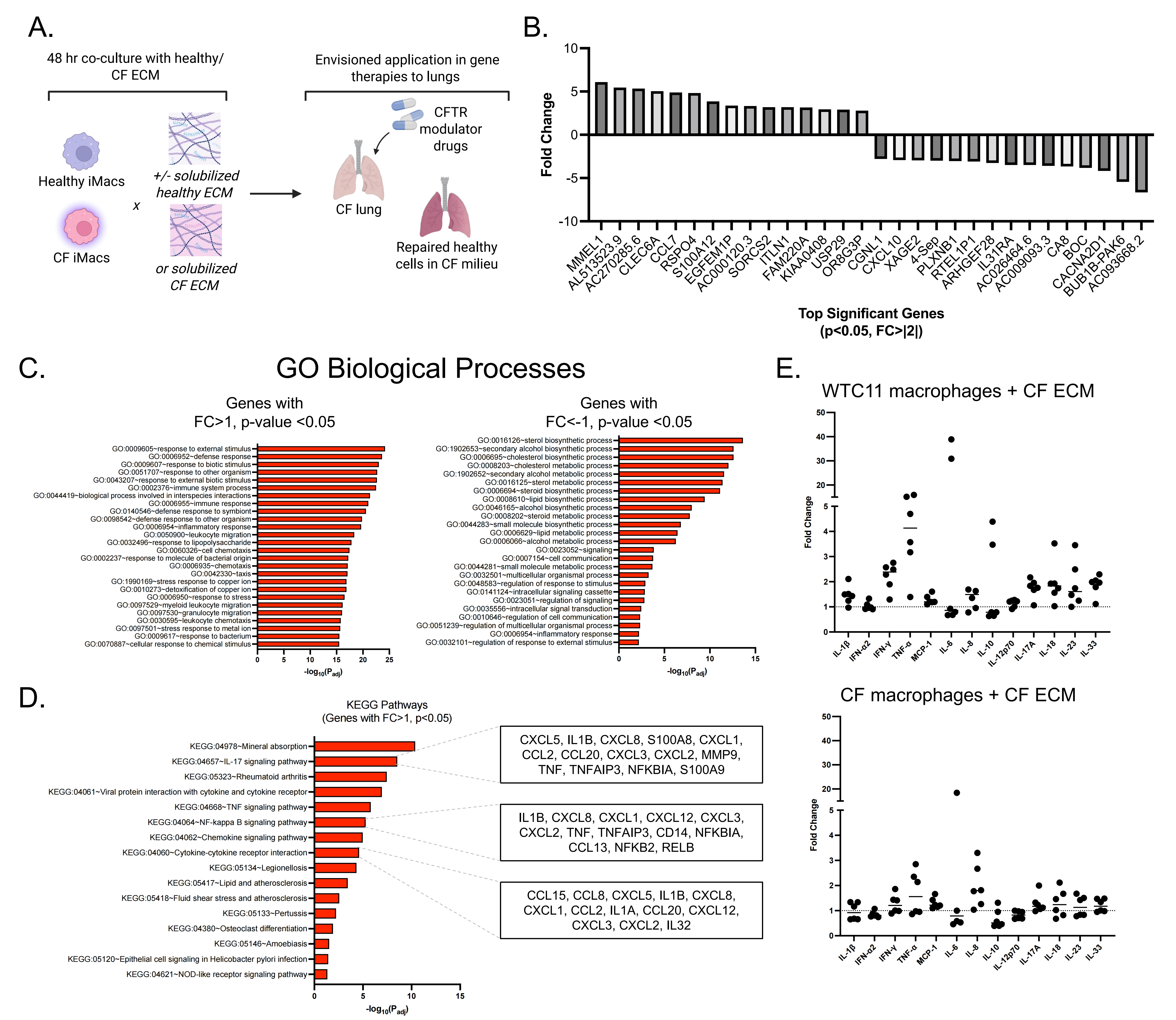 Figure 4. Co-culture of iM0s with healthy or CF ECM materials. (A) Overview of cell and ECM combinations in experimental design, with envisioned applications in understanding how CFTR modulator-rescued cells may behave in a persistently diseased milieu; (B) Top significant (p < 0.05, FC |2|) differentially expressed genes in control iM0s exposed to CF ECM for 48 hours; (C) GO biological processes for differentially expressed genes with upregulated (> 1) and downregulated (< -1) fold changes; (D) KEGG pathways associated with upregulated (> 1) differentially expressed genes, with highlighted genes for key pathways; (E) Cytokine fold changes of control (WTC11 line) versus CF iM0s (F508del line) in response to decellularized, and solubilized, CF ECM. Created in BioRender.com. ECM: extracellular matrix; CF: cystic fibrosis; CFTR: cystic fibrosis transmembrane conductance regulator; KEGG: Kyoto Encyclopedia of Genes and Genomes.