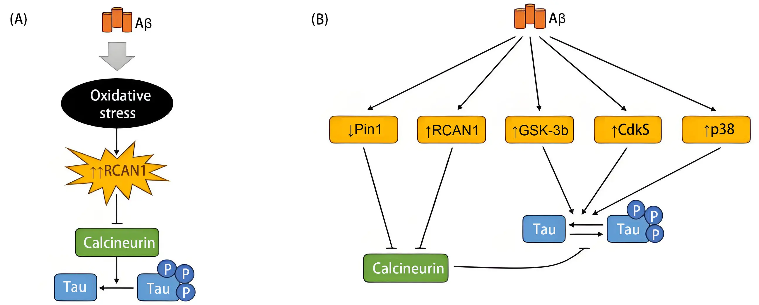 Figure 1. Amyloid pathology promotes tau phosphorylation. (A) Aggregated amyloid peptides may inhibit tau phosphatases, leading to the sustained presence of phosphorylated tau; (B) Amyloid aggregates can also promote the activation of specific tau kinases, enhancing tau phosphorylation. Aβ: amyloid beta; RCAN1: regulator of calcineurin 1; GSK-3b: glycogen synthase kinase 3β; Cdk5: cyclin-dependent kinase 5; Pin1: peptidyl-prolyl cis-trans isomerase NIMA-interacting 1; p38: p38 mitogen-activated protein kinase.