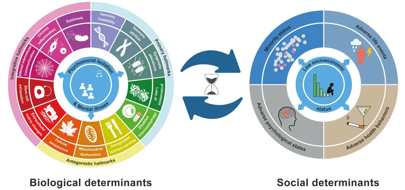 Collectively, these findings support the bidirectional interdependence between social and biological hallmarks in determining health and longevity[3,13,28,29] (Figure 1). Future collaborative research between social scientists and molecular biologists will be essential for elucidating the precise mechanisms through which social circumstances intersect with biological pathways, ultimately shaping individual aging trajectories and the development of age-associated pathologies.