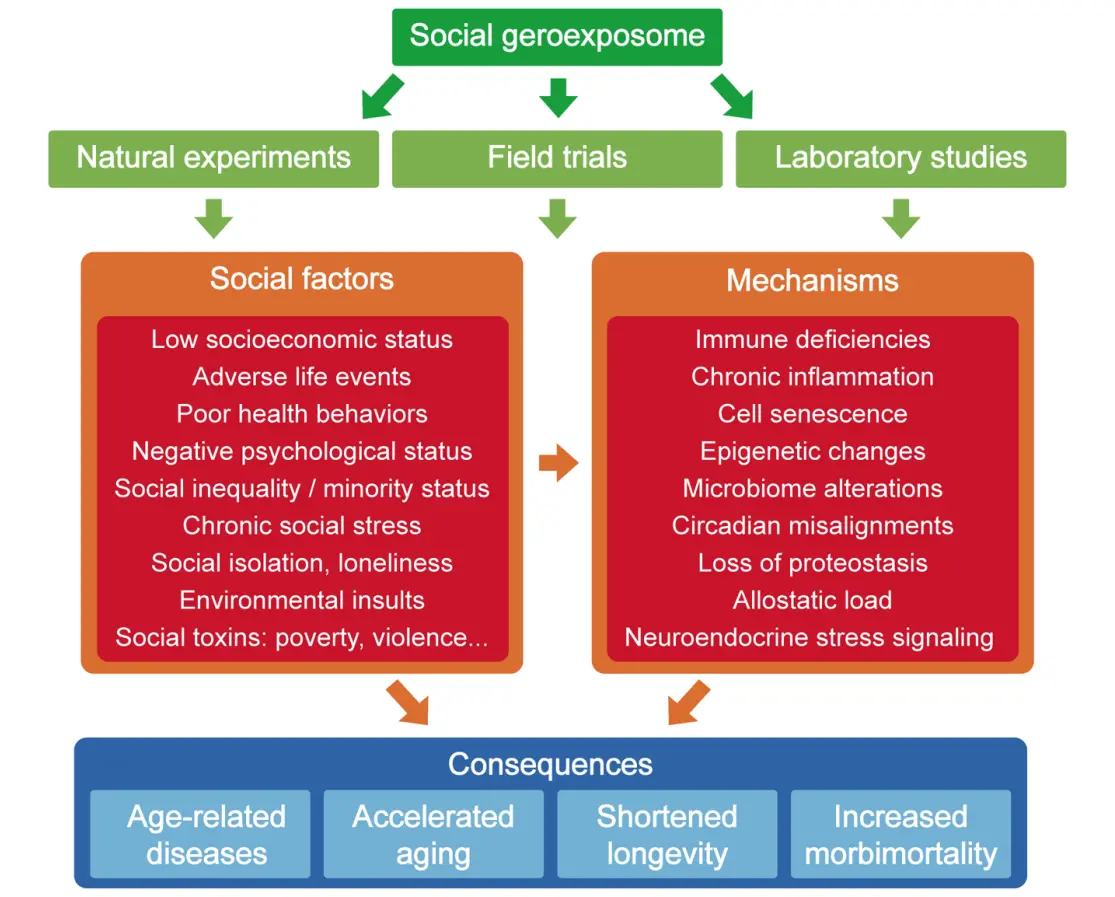 The initial step involves the conceptualization of the social geroexposome, encompassing macro- and microenvironmental social determinants that causally modulate aging trajectories and longevity outcomes. Prior research has approached this task through three complementary methodologies: natural experiments, field trials, and mechanistic laboratory studies[54]. Natural experiments utilize datasets derived from social adversities in contexts such as natural disasters to interrogate downstream impacts on aging phenotypes and disease susceptibility. Field trials manipulate environmental or social conditions in defined communities to quantify causal improvements in healthspan and quality of life. Laboratory studies employ in vitro and in vivo experimental models to establish mechanistic linkages between social exposures and molecular or cellular aging processes[54]. The integration of these approaches has facilitated the mapping of causal pathways constituting the geroexposome (Figure 2).