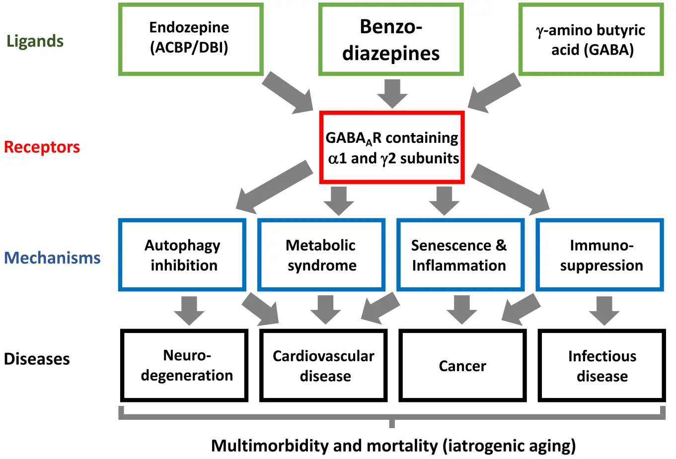 Despite the compelling correlation between benzodiazepine use and age-related diseases, several limitations must temper causal interpretations. First, most clinical data are observational or retrospective, rendering them inherently susceptible to confounding by indication, reverse causality, and selection bias. For instance, conditions such as anxiety, insomnia, or early cognitive decline (which may be early manifestations of neurodegenerative or systemic diseases) often prompt benzodiazepine prescriptions, complicating efforts to distinguish cause from effect. Second, while many studies attempt to adjust for socioeconomic status and comorbidities, residual confounding is possible, particularly given the well-documented association between socioeconomic deprivation and increased benzodiazepine use. Third, preclinical evidence, though supportive, is restricted in scope and often constrained to specific disease models or rodent strains, raising questions about translational relevance. Another limitation include the absence of direct molecular evidence of aging acceleration (e.g., epigenetic, proteomic or telomeric clocks) in benzodiazepine users, precluding definitive classification of the drugs as gerontogens. In addition, while DBI primarily acts peripherally and does not cross the blood-brain barrier, benzodiazepines are centrally acting agents, raising questions about the spatial overlap of their respective effects. Other key differences involve distinct interactions with peripheral benzodiazepine receptors (e.g., TSPO), which may confer divergent downstream effects on mitochondrial function and inflammation.