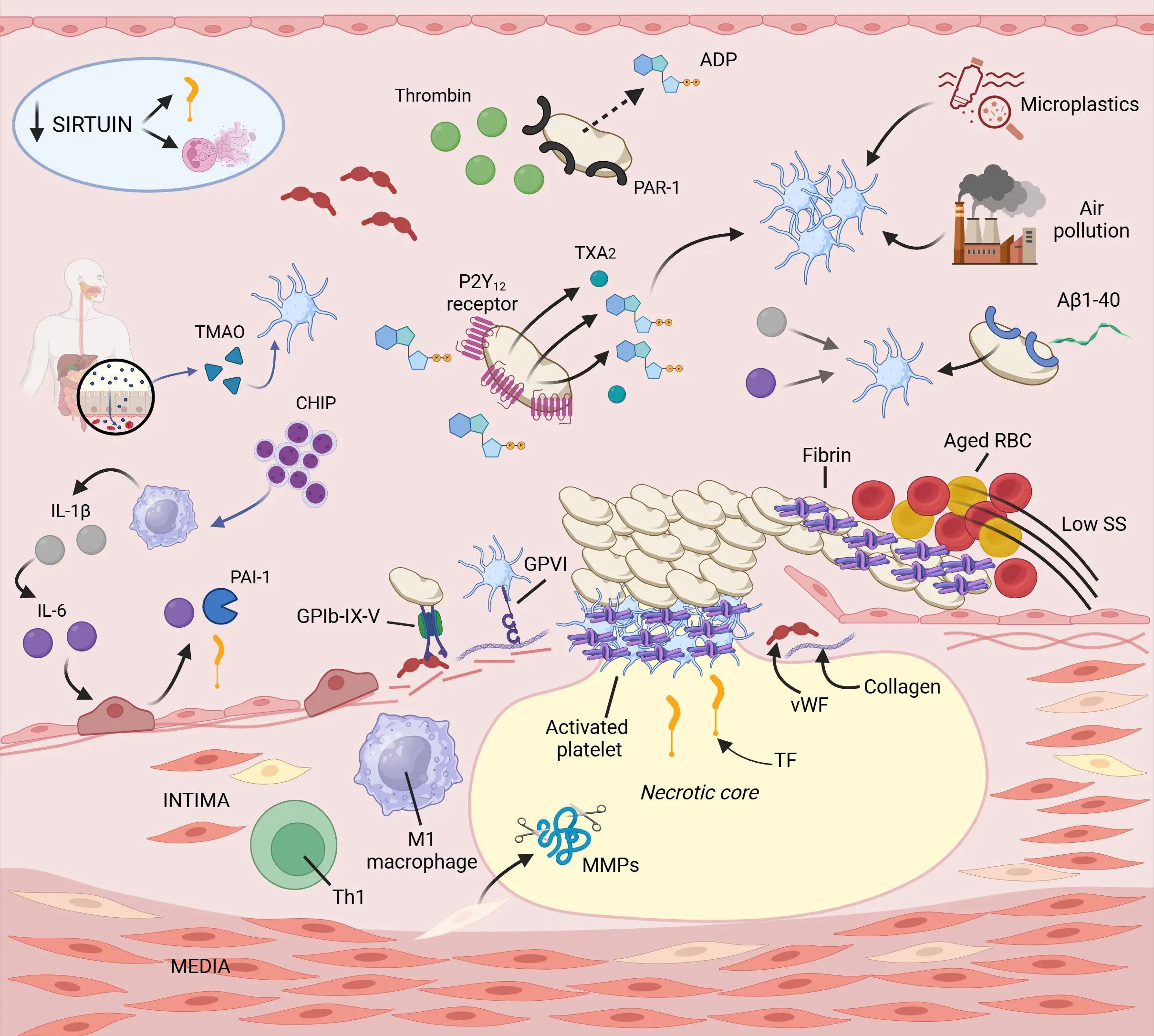 Figure 1. Arterial thrombosis in the elderly. With advancing age, arterial hemostasis is recalibrated from repair to persistence. The elderly are often characterized by sustained, low-grade inflammation, where innate immune cells, especially macrophages, release IL-1β, IL-6, and TNF-α. Although these molecules exert their prothrombotic effects by activating platelets, facilitating NETosis, and promoting endothelial senescence and dysfunction, chronic inflammation is maintained due to sustained stimuli. CHIP is characterized by mutations in HSCs that lead to hyperactive macrophages. During aging, there is a shift from gut symbiosis to dysbiosis, which acts as a source of inflammatory molecules. Simultaneously, increased gut permeability allows gut metabolites, such as TMAO, to enter the circulation and activate platelets. A remarkable characteristic of aged platelets is the “paradox” of ADP hypersensitivity combined with thrombin resistance. Reductions in sirtuin 1 levels lead to increased NETosis and tissue factor expression. Chemical pollutants, including microplastics and air pollution, accumulate over the years and thereby activates the coagulation cascade and platelets. Apart from these cellular changes, circulating prothrombotic factors, such as vWF and Aβ1-40, are present at elevated levels. Created in BioRender.com. IL: interleukin; TNF: tumor necrosis factor; CHIP: clonal hematopoiesis of intermediate potential; HSCs: hematopoietic stem cells; TMAO: trimethylamine-N-oxide; ADP: adenosine diphosphate; vWF: von Willebrand factor; β1-40: amyloid beta; TF: tissue factor; GPVI: glycoprotein VI; RBC: red blood cell; SS: shear stress; NETosis: neutrophil extracellular trap formation.