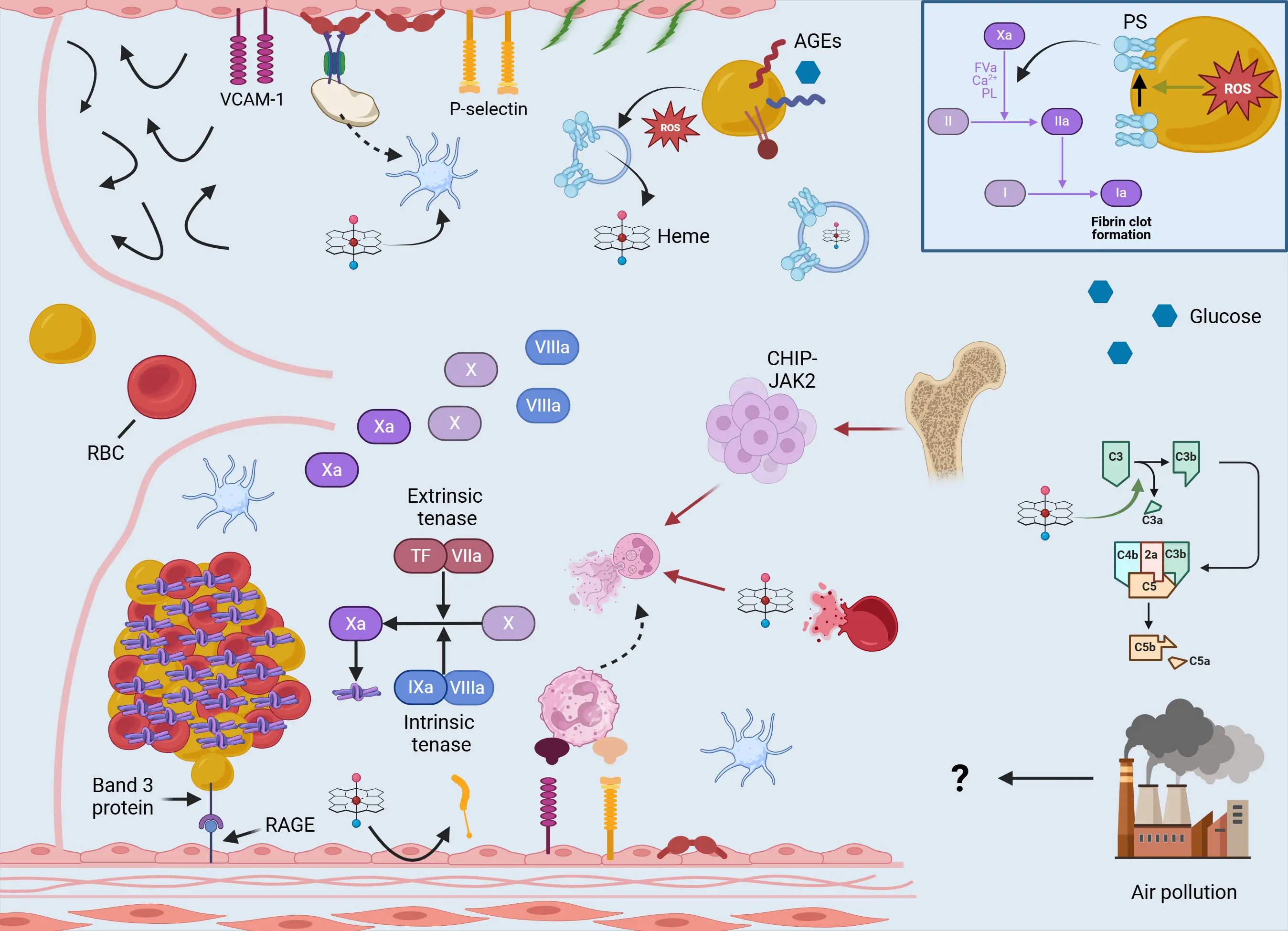 Figure 2. Venous thrombosis in the elderly. Aging modifies the venous thrombotic field, as endothelial activation and dysfunction predominate, leading to increased expression of adhesion molecules such as VCAM-1 and P-selectin. Aged venous valve pockets and age-related immobility create regions of low shear stress and stasis, predisposing to thrombus formation. Aging is associated with increased circulating levels of procoagulant factors (e.g., factors VIII, IX, and X; von Willebrand factor; and PAI-1), thus promoting a shift toward thrombosis through alterations in both coagulation and fibrinolytic pathways. RBCs emerge as key regulators of venous thrombosis in aged individuals, as abundant circulating ROS enhance a distinct phenotype in which RBCs expose PS, a critical component of the prothrombinase complex, and secrete thrombogenic MVs containing heme. In turn, heme, derived from MVs or lysed erythrocytes, exerts multiple effects, including increased NETosis, platelet activation, complement activation, and tissue factor expression from endothelial cells. Hyperglycemic conditions, such as those in diabetic patients, further augment erythrocyte dysfunction. In addition, mutations leading to CHIP, particularly the JAK2 mutation, amplify the formation of NETs, contributing to thrombus growth. As mentioned in the main text, older individuals have accumulated exposure to chemical pollution. Although the role of air pollution is well established in arterial thrombosis, its contribution to venous thrombosis remains less clear. Created in BioRender.com. VCAM-1: vascular cell adhesion molecule 1; RBCs: red blood cells; ROS: reactive oxygen species; PS: phosphatidylserine; MVs: microvesicles; CHIP: clonal hematopoiesis of intermediate potential; NETs: neutrophil extracellular traps; AGEs: advanced glycation end-products; RAGE: receptor for advanced glycation end products; TF: tissue factor; NETosis: neutrophil extracellular trap formation.