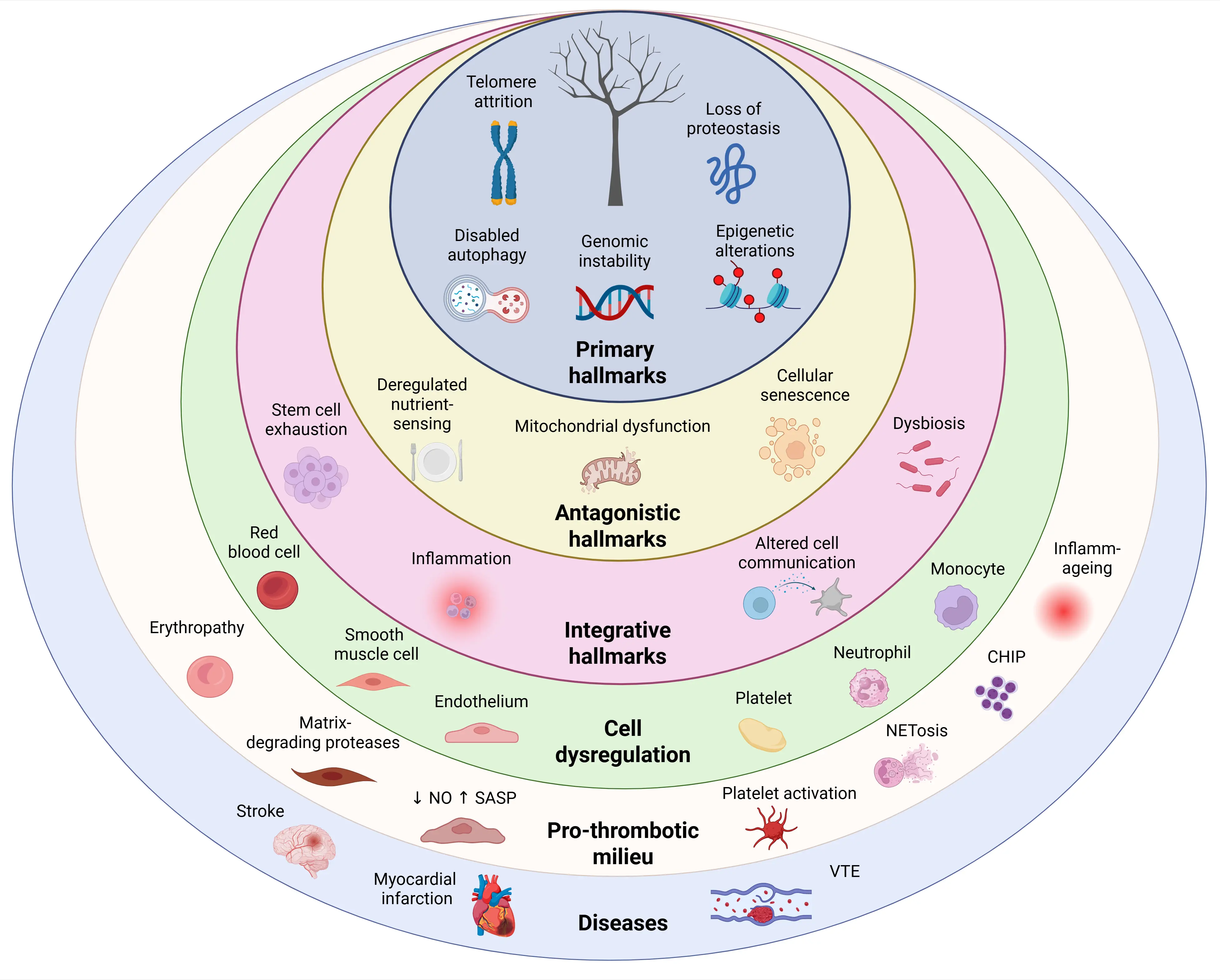 Figure 3. Hallmarks of aging: key regulators of thrombotic disease. In the innermost ring, primary hallmarks of aging (telomere attrition, genomic instability, loss of proteostasis, epigenetic alterations and defective autophagy), which represent the initial sources of damage, drive the development of antagonistic hallmarks (cellular senescence, mitochondrial dysfunction and deregulated nutrient sensing), reflecting adaptive responses to this damage. These changes give rise to integrative hallmarks (stem cell exhaustion, chronic systemic inflammation, altered intercellular communication and gut dysbiosis), which in turn cause dysregulation of vascular and blood cells (endothelium, smooth muscle cells, red blood cells, platelets, neutrophils and monocytes), accumulation of CHIP, matrix-degrading proteases, NETosis and inflammaging. Together, these alterations promote a pro-thrombotic milieu, ultimately contributing to arterial and venous thrombotic diseases, including myocardial infarction, stroke and VTE. Created in BioRender.com. CHIP: clonal haematopoiesis of indeterminate potential; VTE: venous thromboembolism; SASP: senescence-associated secretory phenotype; NETosis: neutrophil extracellular trap formation.