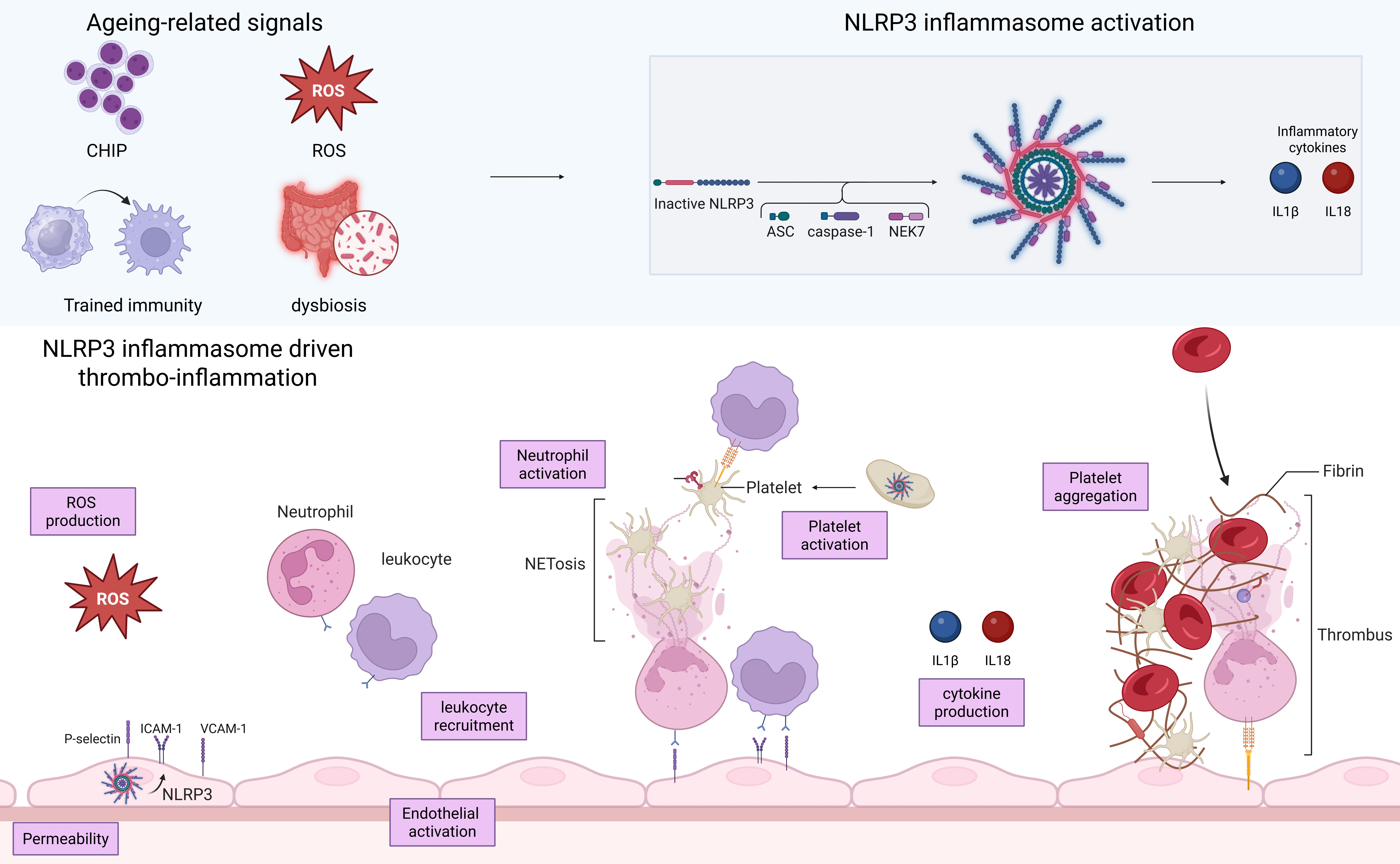 Figure 4. NLRP3 inflammasome activation as a driver of age-related platelet and endothelial dysfunction. Ageing-associated stimuli, including CHIP, increased ROS, trained immunity and gut dysbiosis, converge to activate the NLRP3 inflammasome. Assembly of the NLRP3 complex with ASC, caspase-1 and NEK7 leads to the maturation and release of the pro-inflammatory cytokines IL-1β and IL-18 (top panel). In the vasculature (bottom panel), NLRP3 activation in endothelial cells increase vascular permeability, increase ROS production, and promote endothelial activation with up-regulation of adhesion molecules, favouring leukocyte recruitment and neutrophil activation. Activated neutrophils undergo NETosis and produce cytokines that further amplify inflammation. At the same time, NLRP3 is activated intrinsically within platelets, enhancing platelet activation and aggregation. Together with fibrin deposition, these processes culminate in thrombus formation. Created in BioRender.com. ASC: apoptosis-associated speck-like protein; CHIP: clonal haematopoiesis of indeterminate potential; IL: interleukin; NETosis: neutrophil extracellular trap formation; NLRP3: NOD-, LRR- and pyrin domain-containing protein 3; ROS: reactive oxygen species.