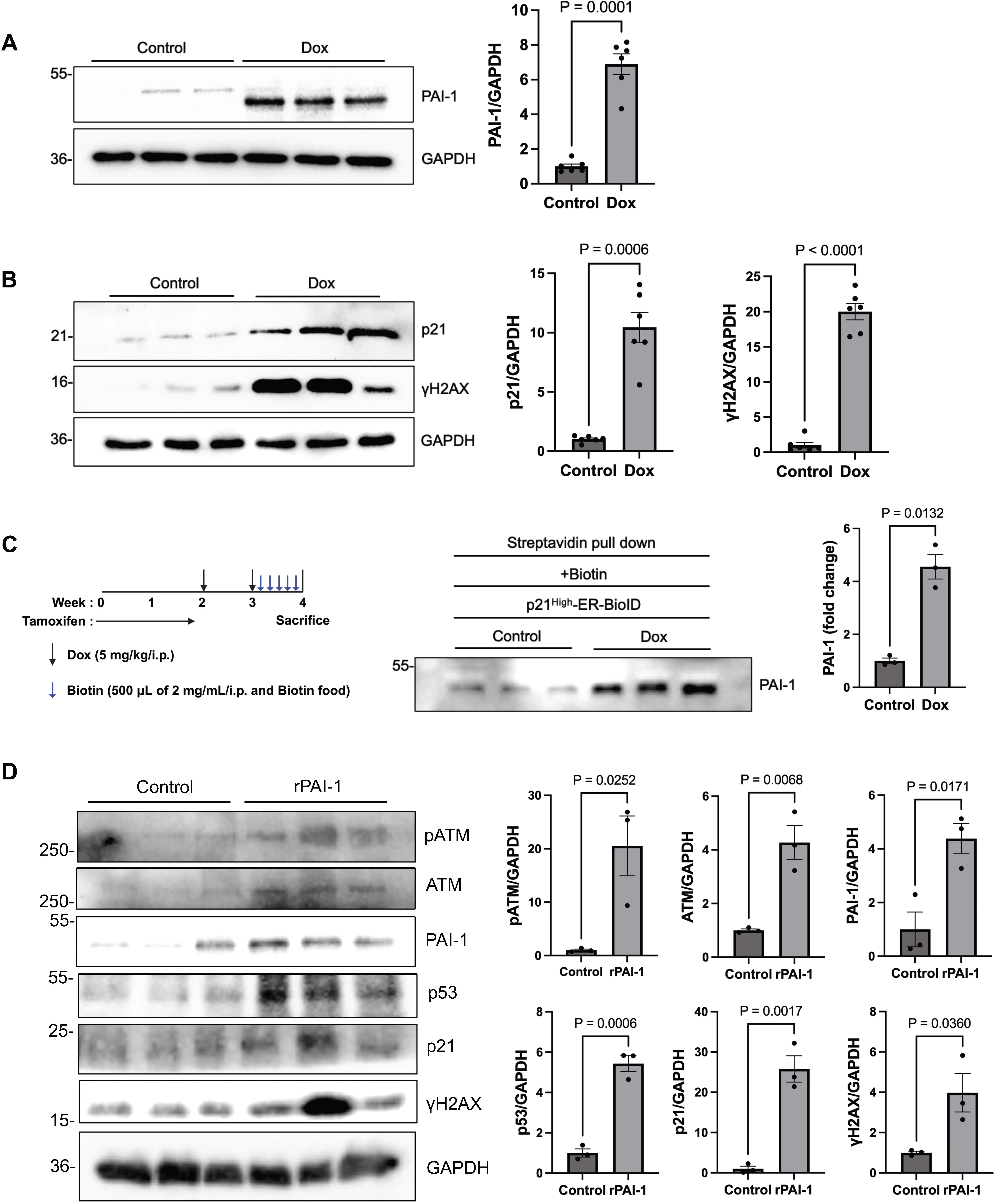 Figure 2. PAI-1 and other cellular senescence markers are elevated in cardiomyocytes exposed to Dox. (A) Left: Western blot analysis of PAI-1 in NRVMs treated with PBS (control) or Dox. Right: Quantification of PAI-1 band intensity; (B) Left: Western blot analysis of p21 and γH2AX in control or Dox-treated NRVMs. Right: Quantification of p21 and γH2AX band intensity; (C) Left: Schematic representation of the tamoxifen, Dox, and biotin administration protocol in p21High-ER-BioID mice. Center: Western blot analysis of PAI-1 in serum from p21High-ER-BioID mice treated with PBS + biotin (control) or Dox + biotin. Right: Quantification of PAI-1 band intensity; (D) NRVMs were treated with